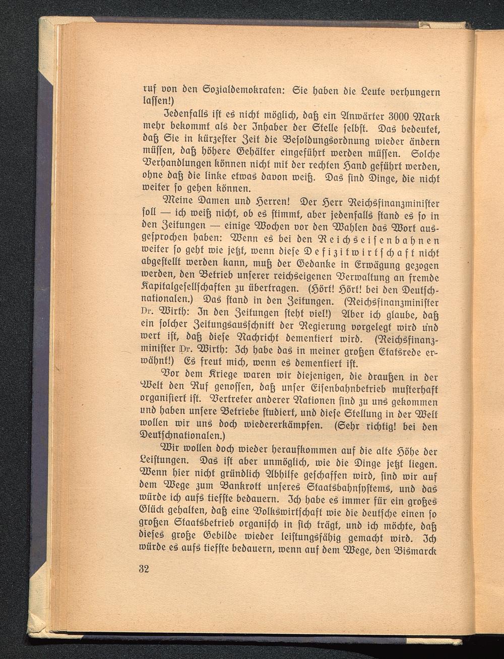 Meine Damen und Herren! Der Herr Reichsfinanzministersoll — ich weiß nicht, ob es stimmt, aber jedenfalls stand es so inden Zeitungen — einige Wochen vor den Wahlen das Wort aus-gesprochen haben: Wenn es bei den Reichseisenbahnenweiter so geht wie jetzt, wenn diese Defizitwirtschaft nichtabgestellt werden kann, muß der Gedanke in Erwägung gezogenwerden, den Betrieb unserer reichseigenen Verwaltung an fremdeKapitalgesellschaften zu übertragen. (Hört! Hört! bei den Deutsch -nationalen.) Das stand in den Zeitungen. (Reichsfinanzministervr. Wirth: In den Zeitungen steht viel!) Aber ich glaube, daßein solcher Zeitungsausschnitt der Regierung vorgelegt wird undwerk ist, daß diese Nachricht dementiert wird. (Reichsfinanz-minister Dr. Wirth: Ich habe das in meiner großen Etatsrede er-wähnt!) Es freut mich, wenn es dementiert ist.