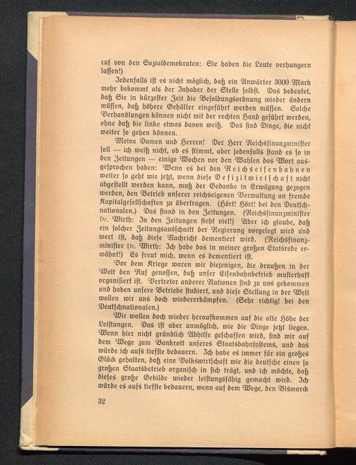 Wir wollen doch wieder herauskommen aus die alte Höhe derLeistungen. Das ist aber unmöglich, wie die Dinge jetzt liegen.Wenn hier nicht gründlich Abhilfe geschaffen wird, find wir aufdem Wege zum Bankrott unseres Staatsbahnsystems, und daswürde ich aufs tiefste bedauern. Ich habe es immer für ein großesGlück gehalten, daß eine Volkswirtschaft wie die deutsche einen sogroßen Staatsbetrieb organisch in sich trägt, und ich möchte, daßdieses große Gebilde wieder leistungsfähig gemacht wird. Ichwürde es aufs tiefste bedauern, wenn auf dem Wege, den Bismarck