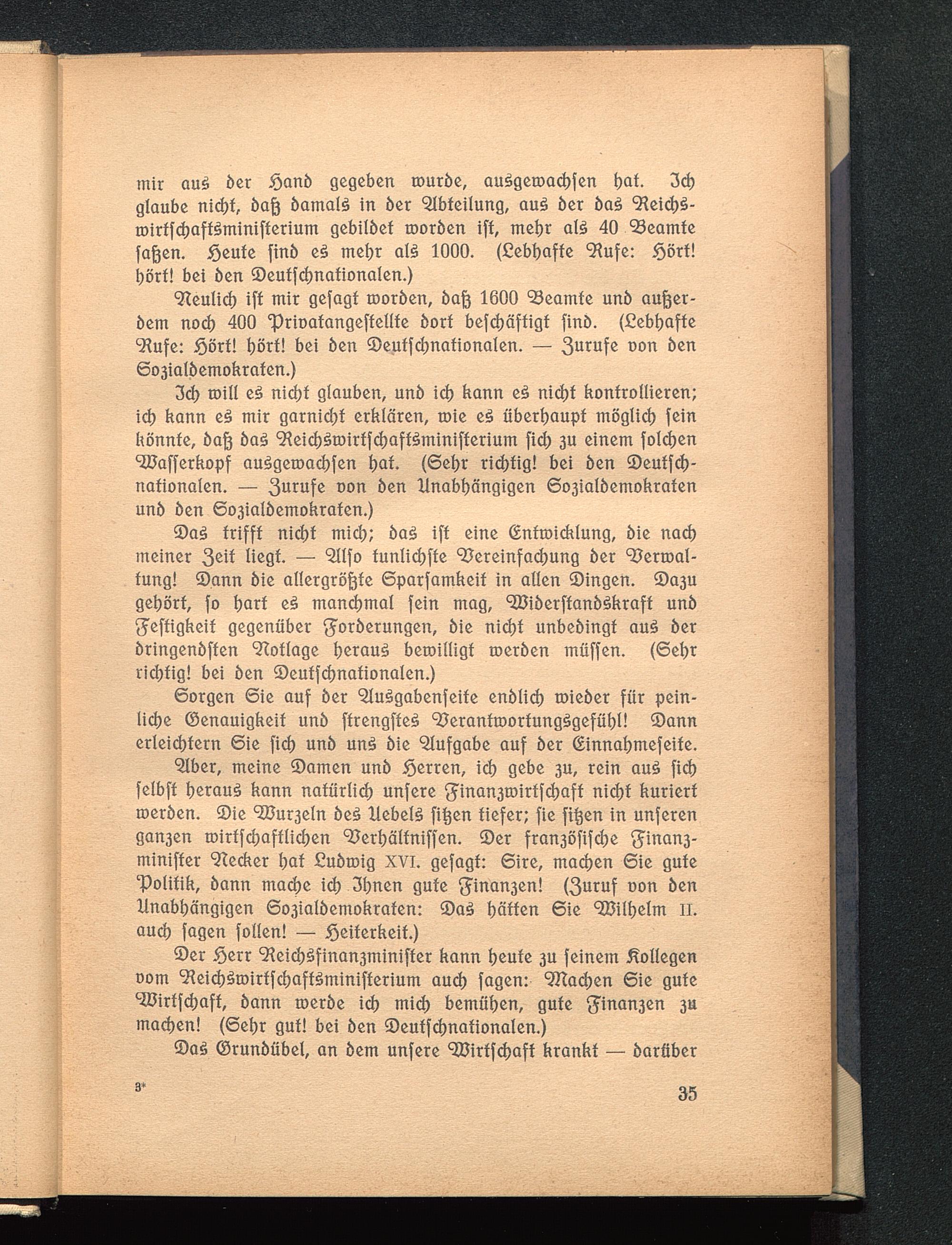 Aber, meine Damen und Herren, ich gebe zu, rein aus sichselbst heraus kann natürlich unsere Finanzwirkschaft nicht kuriertwerden. Die Wurzeln des Uebels sitzen tiefer; sie sitzen in unserenganzen wirtschaftlichen Verhältnissen. Der französische Finanz-minister Necker hak Ludwig xvi. gesagt: Sire, machen Sie gutePolitik, dann mache ich Ihnen gute Finanzen! (Zuruf von denUnabhängigen Sozialdemokraten: Das hätten Sie Wilhelm II.auch sagen sollen! — Heiterkeit.)