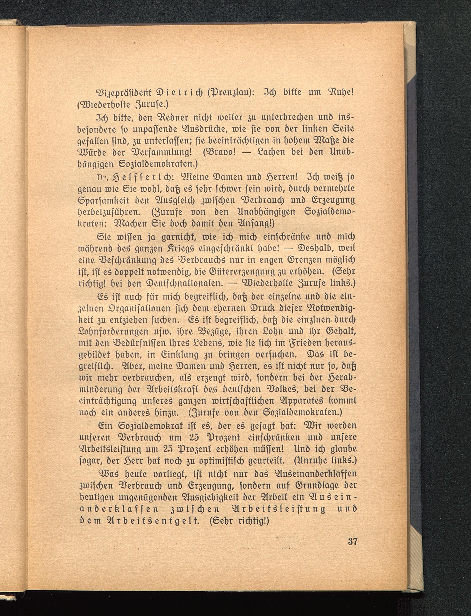 Sie wissen ja garnicht, wie ich mich einschränke und michwährend des ganzen Kriegs eingeschränkt habe! — Deshalb, weileine Beschränkung des Verbrauchs nur in engen Grenzen möglichist, ist es doppelt notwendig, die Gütererzeugung zu erhöhen. (Sehrrichtig! bei den Deutschnationalen. — Wiederholte Zurufe links.)
