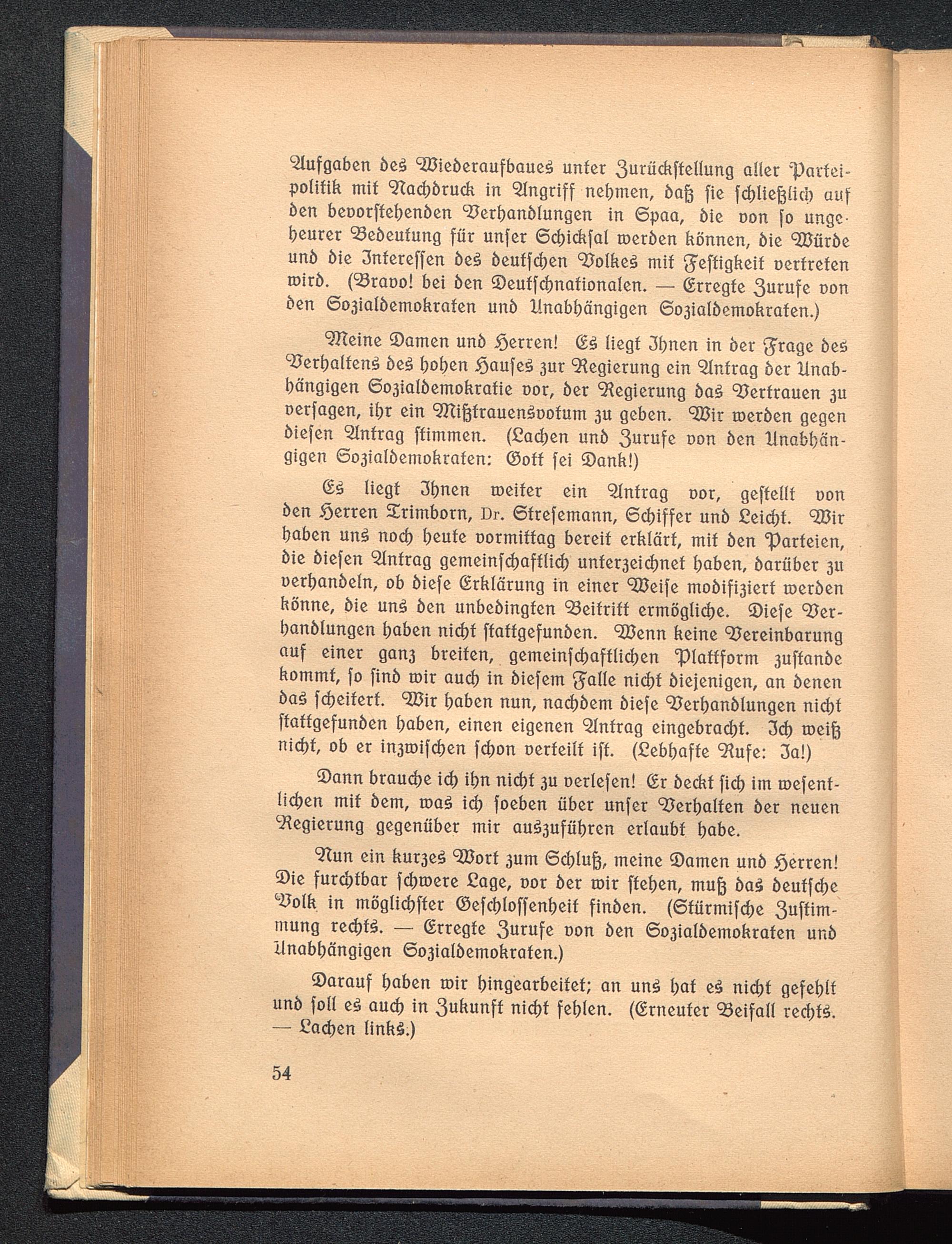 Aufgaben des Wiederaufbaues unker Zurückstellung aller Partei-Politik mit Nachdruck in Angriff nehmen, daß sie schließlich aufden bevorstehenden Verhandlungen in Spaa, die von so ungeheurer Bedeutung für unser Schicksal werden können, die Würdeund die Interessen des deutschen Volkes mit Festigkeit vertretenwird. (Bravo ! bei den Deutschnationalen. — Erregte Zurufe vonden Sozialdemokraten und Anabhängigen Sozialdemokraten.)