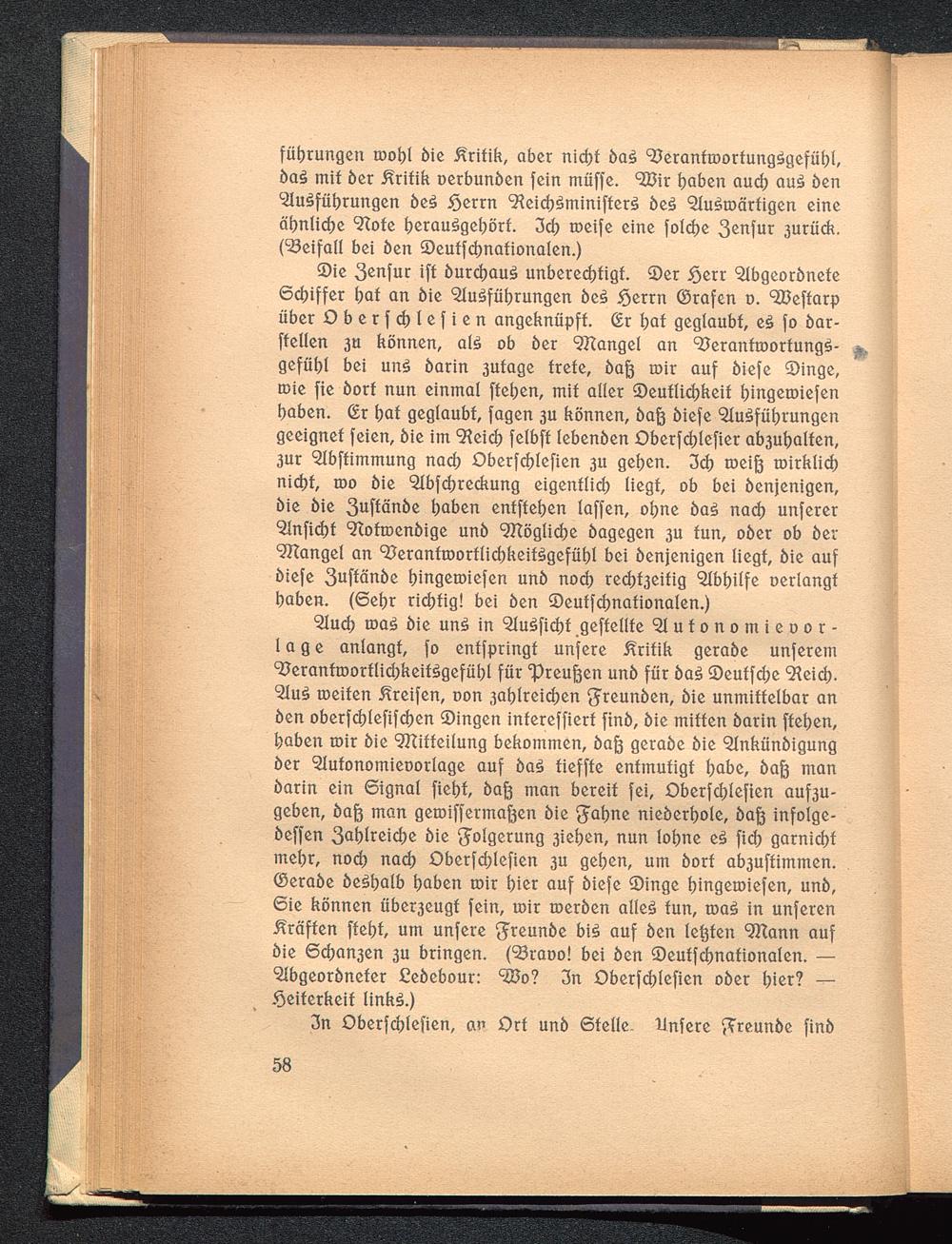 Die Zensur ist durchaus unberechtigt. Der Herr AbgeordneteSchiffer hat an die Ausführungen des Herrn Grafen v. Westarpüber Oberschlesien angeknüpft. Er hat geglaubt, es so dar-stellen zu können, als ob der Mangel an Verantwortungs-gefühl bei uns darin zutage trete, daß wir auf diese Dinge,wie sie dort nun einmal stehen, mit aller Deutlichkeit hingewiesenhaben. Er hat geglaubt, sagen zu können, daß diese Ausführungengeeignet seien, die im Reich selbst lebenden Oberschlesier abzuhalten,zur Abstimmung nach Oberschlesien zu gehen. Ich weiß wirklichnicht, wo die Abschreckung eigentlich liegt, ob bei denjenigen,die die Zustände haben entstehen lassen, ohne das nach unsererAnsicht Notwendige und Mögliche dagegen zu tun, oder ob derMangel an Verantwortlichkeitsgefühl bei denjenigen liegt, die aufdiese Zustände hingewiesen und noch rechtzeitig Abhilfe verlangthaben. (Sehr richtig! bei den Deutschnationalen.)
