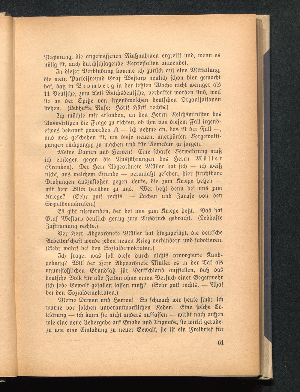 Zch frage: was soll diese durch nichts provozierte Kund-gebung? Will der Herr Abgeordnete Müller es in der Tat alsunumstößlichen Grundsatz für Deutschland aufstellen, daß dasdeutsche Volk für alle Zeiten ohne einen Versuch einer Gegenwehrsich jede Gewalt gefallen lassen muß? (Sehr gut! rechts. — Aha!bei den Sozialdemokraken.)