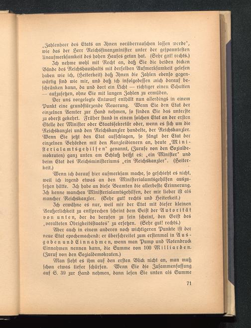 Aber auch in einem anderen noch wichtigeren Punkte ist derneue Etat epochemachend: er überschreitet zum erstenmal in A u s -gaben und Einnahmen, wenn man Pump und NotendruckEinnahmen nennen kann, die Summe von IM Milliarden.(Zuruf von den Sozialdemokraten.)