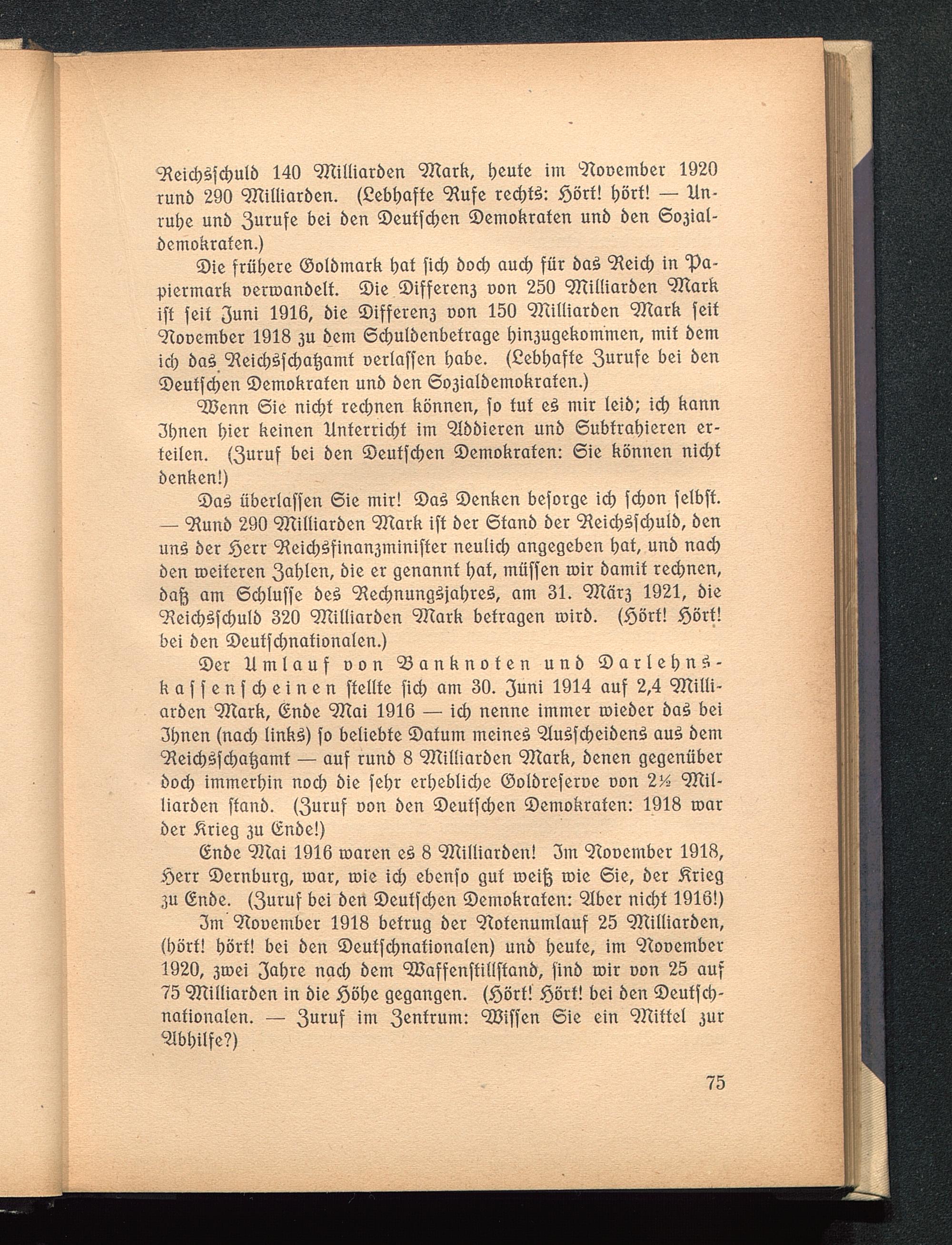 Reichsschuld 140 Milliarden Mark, heute im November 1920r und 290 Milliarden. (Lebhafte Rufe rechts: Hört! hört! — Un-ruhe und Zurufe bei den Deutschen Demokraten und den Sozial-demokraten.)