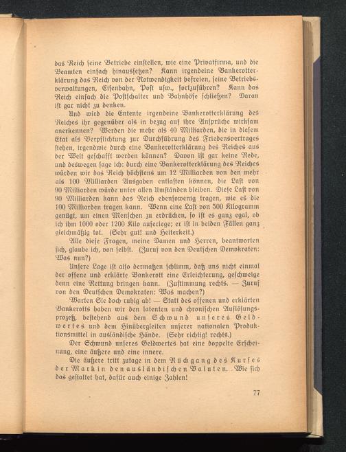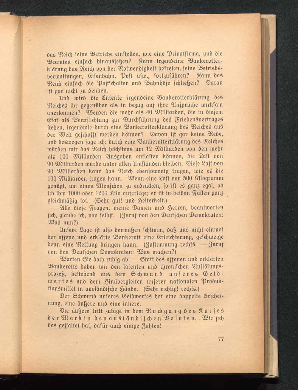 Unsere Lage ist also dermaßen schlimm, daß uns nicht einmalder offene und erklärte Bankerott eine Erleichterung, geschweigedenn eine Rettung bringen kann. (Zustimmung rechts. — Zurufvon den Deutschen Demokraten: Was machen?)