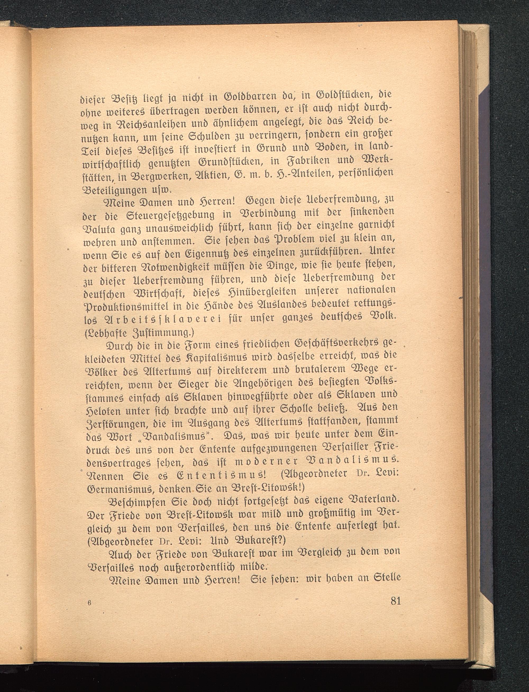 Durch die in die Form eines friedlichen Geschäftsverkehrs ge-kleideten Mittel des Kapitalismus wird dasselbe erreicht, was dieVölker des Altertums aus direkterem und brutalerem Wege er-reichten, wenn der Sieger die Angehörigen des besiegten Volks-stammes einfach als Sklaven hinwegführte oder als Sklaven undHeloten unter sich brachte und aus ihrer Scholle beließ. Aus denZerstörungen, die im Ausgang des Altertums stattfanden, stammtdas Wort „Vandalismus". Das, was wir heute unter dem Ein-druck des uns von der Entente ausgezwungenen Versailler Frie-densvertrages sehen, das ist moderner Vandalismus.Nennen Sie es Ententismus! (Abgeordneter v--. Levi:Germanismus, denken Sie an Brest-Litowsk!)