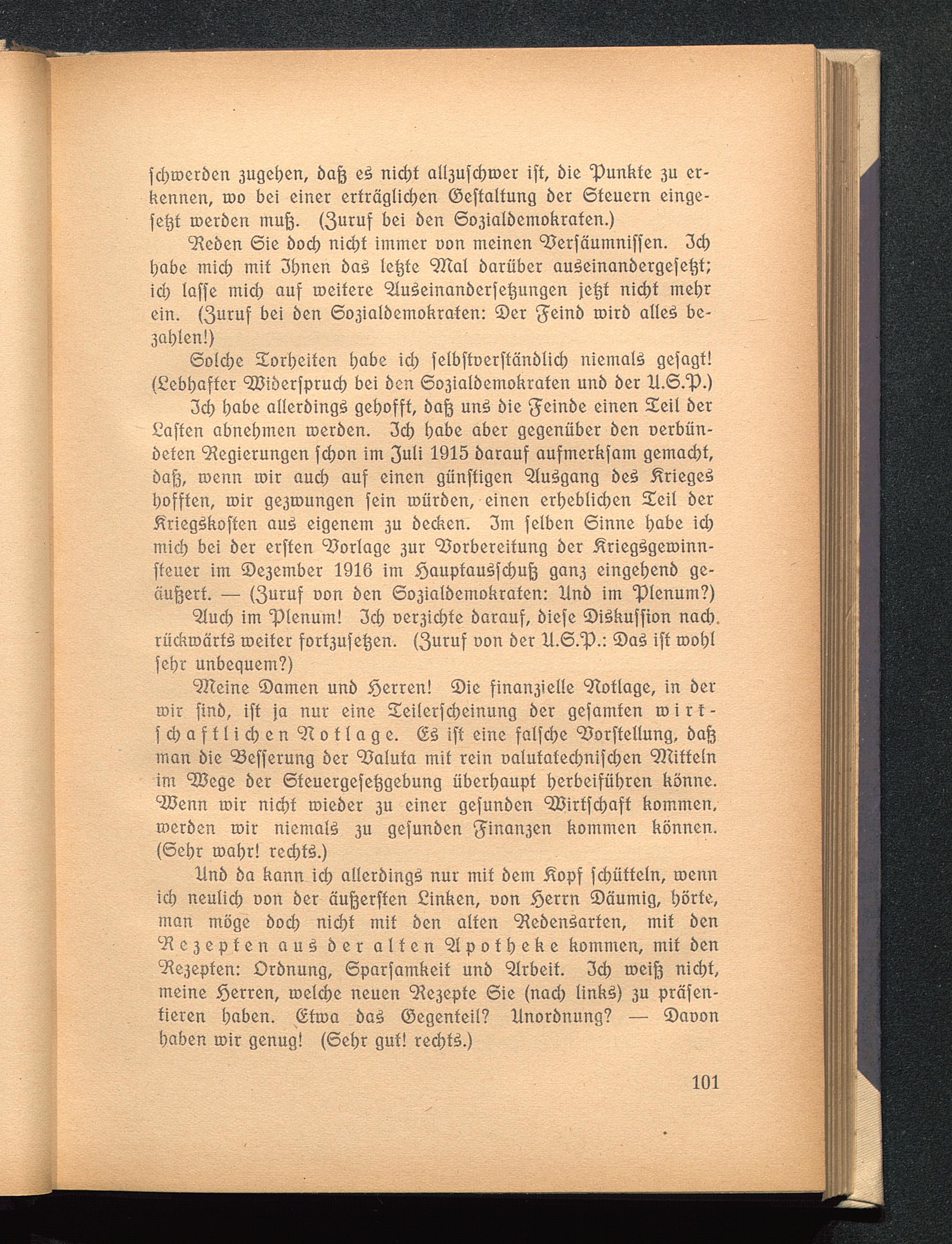 92Teine ©amen unb £erren! ©ie finan3ielle Notlage, in bermir finb, ift ja nur eine Seilerfcheinung ber gefamten ro i r t -fchaftlid)en Notlage. ift eine falfche Vorftellung, baßman bie 33efferung ber Valuta mit rein oalutatechnifchen Mittelnim <2Bege ber Sfeuergefetjgebung überhaupt herbeiführen könne.C -Q3enn mir nid)f mieber 3U einer gefunben Sßirtfchaft kommen,roerben mir niemals» 3U gefunben $inan3en kommen können.(Sehr roahr! rechte.)