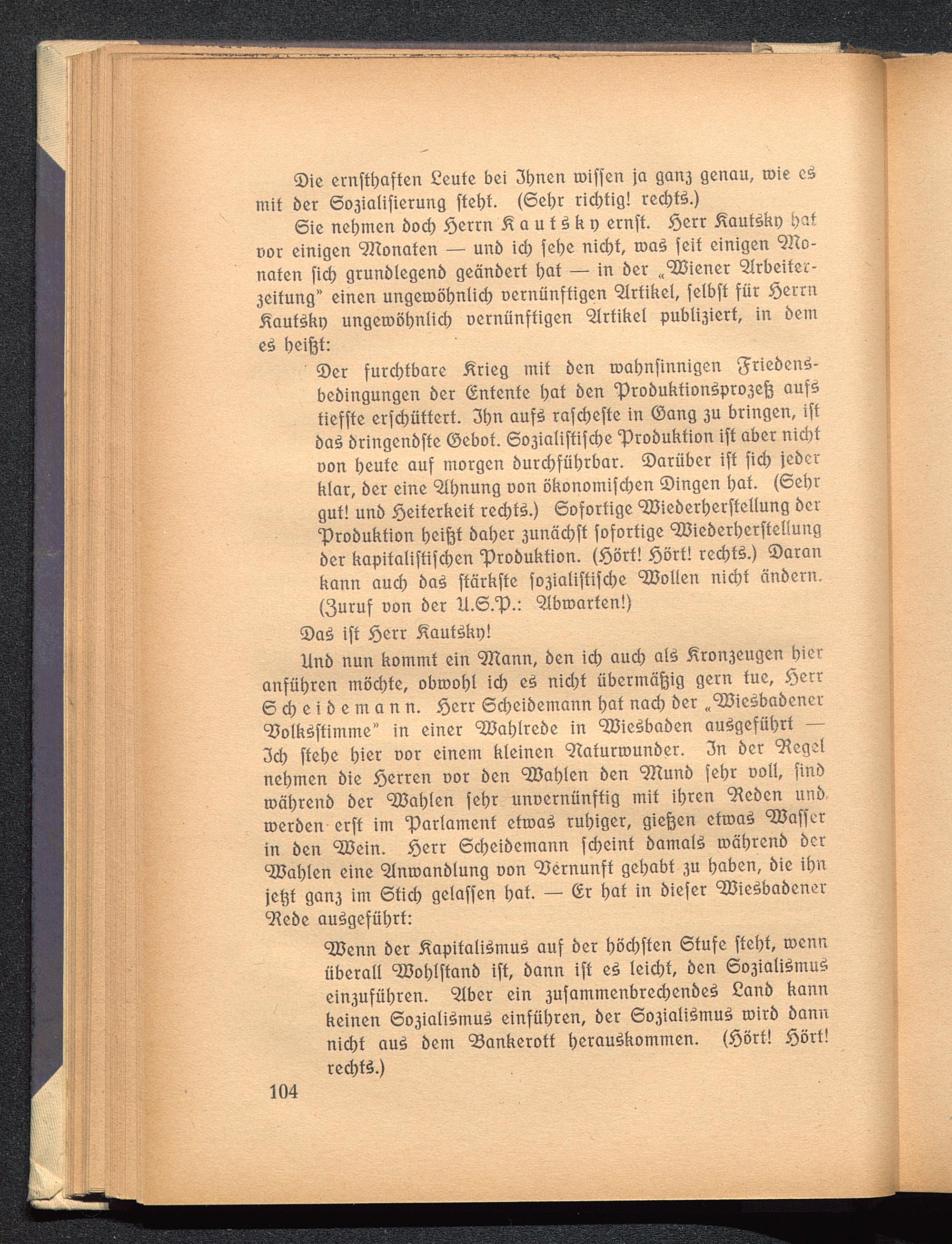 5)er furchtbare £rieg mit öen toabnfinnigen grieöenf-beöingungen 5er (Entente bat öen "proöuktionfproseß aufftieffte erfdjüttert. 3bn auff rafebefte in (Sang 3u bringen, iftöaf öringenöfte ©ebot. 6o3ialiftifcbe 'Proöuktion ift aber nichtoon beute auf morgen öurcbfütjrbar. ©arüber ift fid) jeöerklar, öer eine <2lbnung con ökonomifeben ©ingen bat. (6ebrgut! unö Heiterkeit rechte.) Sofortige sajieöerberftellung öer'Proöuktion beißt öaber 3unäcbff fofortige SCÖieöer^erffcIIungöer kapitaliftifeben 'Proöuktion. (Sört! Jöört! reebtf.) Sarankann aueb öaf ftärkfte fo3ia(iftifd)e Sollen nid>t änöern,(3uruf oon öer il.6. c p.: 'Slbtoarten!)