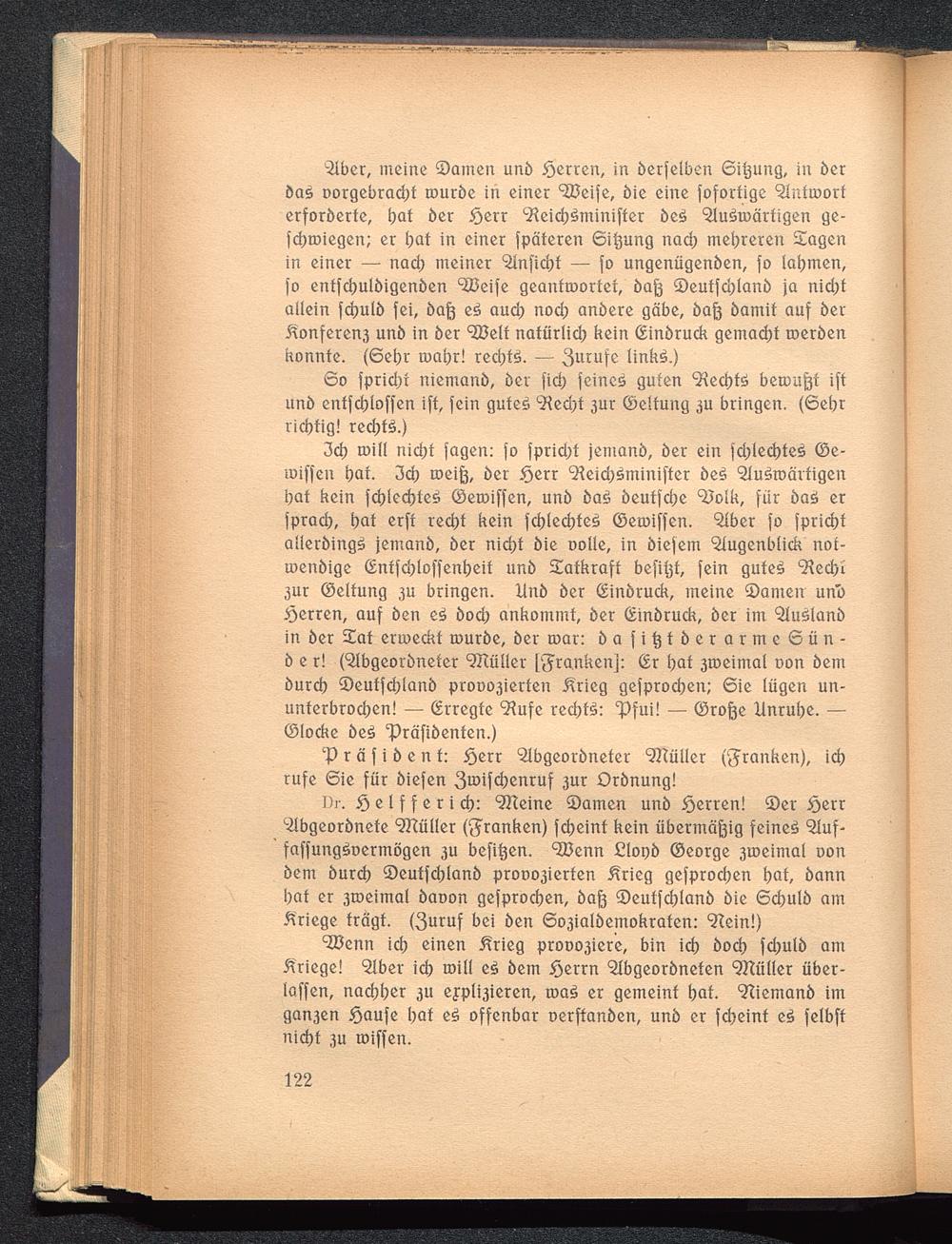 Dr. iöelfferi d>: 'Siceine Samen unb iöerten! ®er JöerrAbgeorbnete 9Küller (franken) febeint kein übermäßig feinet Auf-faffungSoermögen 3U befitjen. SKJenn £lot)b ©eorge 3meimal oonbem burcl) 2)eutfd)lanb probierten Krieg gefproeben bat, bannbat er 3roeimal baoon gefproeben, bafj ©eutfcblanb bie ©cbulb amKriege trägt. (3unif bei ben So3ialbemokraten: 'Kein!)
