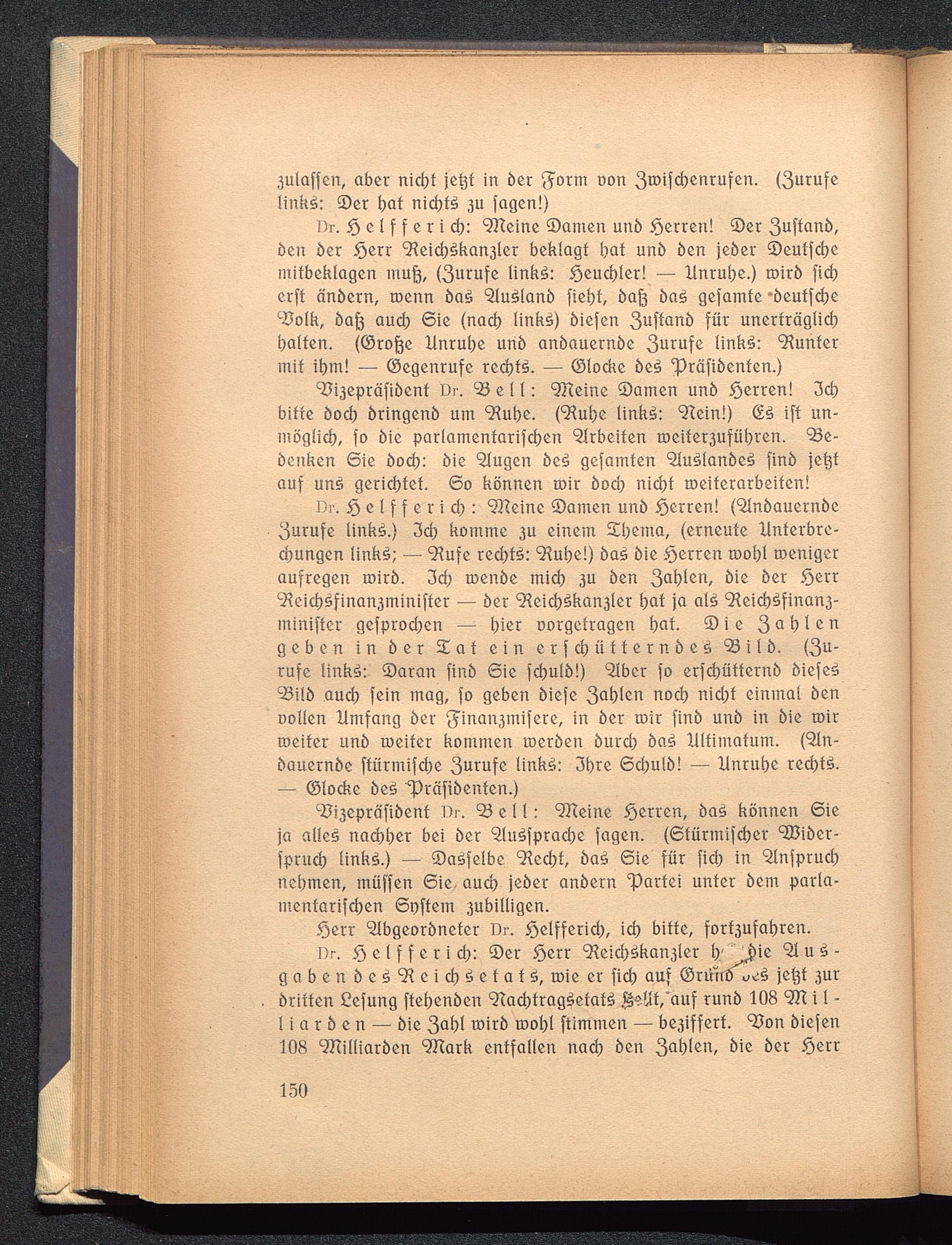 Dr. Q e 1 f f e r i d): 9Heine ©amen unb §erren! (91nbauernbe3urufe linkö.) 3cb komme 3U einem Styema, (erneute Unterbre-chungen linkS; — 9^ufe redjfö: 9*ube!) ba£ bie Herren toobl wenigeraufregen roirb. 3d) roenbe mieb 3U ben 3 a ^ en ' öie ber Jrjerrc 2?eid)Sfinan3miniffer — ber ^eid)ökan3(er t>af ja al£ 9^eid)öfinan3-minifter gefprodjen — l)ier vorgetragen bat- © i e 3 a b l e ngeben in ber £ a t ein erfcbütternöe'3 93 i t b. (3u-rufe linkö: ©aran finb 6ie fcbulb!) 5lber fo erfebüfternb biefeS93ilb aueb fein mofl, fo geben biefe 3 a blen noeb nidjf einmal benDöllen Ilmfang ber $inart3mifere, in ber mir finb unb in bie mirroeifer unb roeifer kommen roerben burd) bas> Ultimatum. (Qtn-bauernbe ffürmifdje 3unife linkö: 3bre 6d)ulb! — Unruhe rechte.— ©locke be£ c präfibenten.)