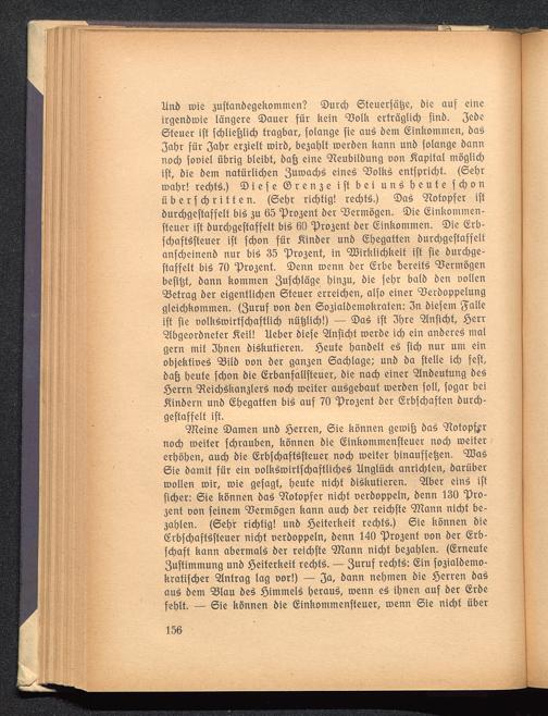 linö mie 3uffanbegekommen? ©urcl) ©feuerfötje, bie auf eineirgenbtoie längere Sauer für kein 9?oIh erträglich finb. 3ebe©teuer iff fd?Iie^tid) fragbar, fotange fie au$ bem (ginkommen, ba33at?r für 3aht eqielf toirb, bc3at)If toerben kann unb folange bannnod) fociel übrig bleibt, baß eine 9teubilbung oon Kapital möglichiff, bie betn natürlichen 3 UH)a d)3 eines QJotkö enffpriebf. (©et)rtoabr! rechts.) © i e f e ® r e n 3 e ift bei u n £ beute f d) o nüberfchriffen. (©ehr richtig! rechte.) ®a£ Sftofopfer iffburdjgeffaffelf bi£ 3U 65 "p^enf ber Vermögen. ©ie Ginkommen-ffeuer iff burd;geffaffelf bi£ 60 P^enf ber Ginkommen. ©ie (Erb-fdjaffSffeuer iff fd)on für ^inber unb (Stjegaffcn burcbgeffaffeltanfeheinenb nur bis» 35 °Pro3enf, in Wirklichkeit iff fie burdjge-ffaffelf bi£ 70 c pro3enf. ©enn toenn ber (Erbe bereift Vermögenbefitjf, bann kommen 3 u fd)läge bin3U, bie fehr balb ben Döllenbefrag ber eigentlichen ©teuer erreichen, alfo einer 9?erboppelunggleichkommen. (3uruf oon ben ©03ialbemokraten: 3n biefem Salleift fie oolkStDirffdjafflid) nüfjlid)!) — ©as> ift 3t>rc Anficht £)etr"Slbgeorbnefer .Seil! lieber biefe Anficht toerbe ich ein anbereS malgern mit 3bnen biSkufieren. Senfe hanbelf e3 fich nur um einobjekfioeS 93ilb oon ber gan3en Sachlage; unb ba ffelle ich feft,ba^ heute fchon bie (Erbanfallffeuer, bie nach einer Qlnbeufung be$Serrn ^eicbSka^lerS noch toeifer ausgebaut roerben foll, fogar beiSinbern unb (Ehegaffen bi£ auf 70 'prosenf ber (Erbfcbaffen burcb-geffaffelt ift.