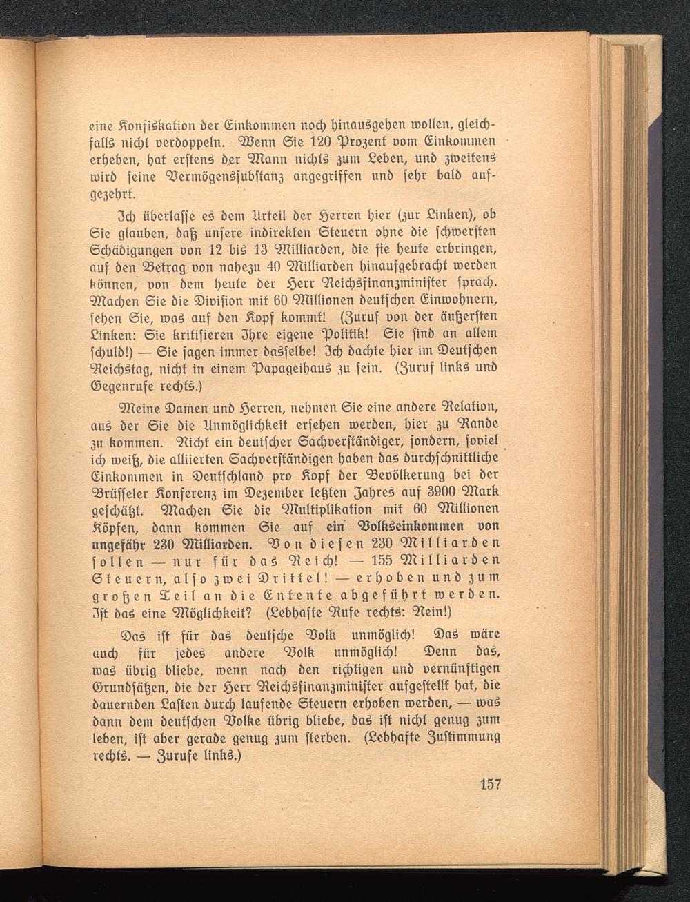 Meine Samen unö Jrjerren, nehmen Sie eine anöere Delation,auS öer Sie öie Unmöglichkeit erfeben roeröen, t)ier 3U 'Kanöe3u kommen. 9Xid)t ein öeutfeher Sachüerftänöiger, fonöern, fooielid? roeift, öie alliierten Sadjnerftänöigen haben öaS öurd)fd)nittlid)eEinkommen in ©eutfcblanö pro Kopf öer ^eoölkerung bei öerSküffeler Konferen3 im ®e3ember legten 3abteS auf 3900 Markgefchätjt. Machen Sie öie Multiplikation mit 60 Millionenköpfen, öann kommen Sie auf ein 9?olhSeinhomtnen oonungefähr 230 Milliaröen. 9J o n ö i e f e n 230 Milliaröenfollen — nur für öaS *21 e ich! — 155 M i 11 i a r ö e nSteuern, alfo 3toei ©rittet! — erhoben unö 3 u tngroßen Seil an öie (Entente abgeführt roeröen.3ft öaS eine Möglichkeit? (Cebbafte 9?ufe red)tS: <?tein!)