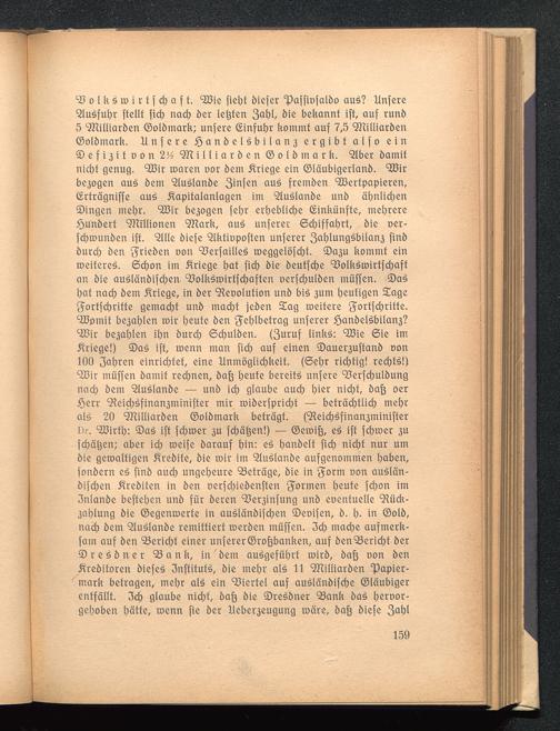 c 2JolkörDirffd?aff. Wie fiept bicfer 'paffiüfalbo au£? Unfere3lu£>fut)r ftellf fiel) nach 5er legten 3 a hl/ öie bekannt iff, auf runb5 ^Ttidiaröen ©olbntark; unfere (Einfuhr kommt auf 7,5 <3Killiarben©olbmark. Unfere i$anbel3bilan3 ergibt alfo ein5) e f i 3 i f con VA 9H i 11 i a r b e n ©olbmark. "Slber bamitnicht genug. SCÖir roaren cor bem Kriege ein ©läubigerlanb. < 2öirbe3ogen au£ bem 3Iu^Ianbe 3inf e n au3 fremben Wertpapieren,(Erfrägniffe au£ Kapitalanlagen im <2lu£>lanbe unb ähnlichenSingen mehr. Wir be3ogen fefjr erhebliche (Einkünfte, mehrereSunberf Millionen 9Hark, au3 unfern - 6d)iffahrt, bie oer-fchumnben iff. "Sllle biefe 'Slktinpoften unferer 3 a blung§bilan3 finbburd) ben ^rieben oon 9?erfaille£ toeggelöfchf. ®a3u kommt einroeifere£. 6cf)on im Kriege (}af fid? bie beuffche 9?olk^toirffd>affan bie auSlänbifchen ^olkSroirffchaffen uerfdjulben müffen. 2)a3hat nach bem Kriege, in ber 9teDolufion unb bi§ 3um heutigen Sagegorffchriffe gemacht unb macht jeben Sag weitere gorffdjriffe.Womit be3at)Ien tuir heute ben gehlbefrag unferer <5anbels>bilan3?Wir be3af)ten ihn burcl) Schulben. (3uruf linkS: Wie 6ie imKriege!) 5)a3 iff, roenn man fid) auf einen S>auer3uffanb oon100 3<ri)ten einrichtet, eine Unmöglichkeit. (Sehr richtig! rechts!)Wir muffen bamit rechnen, bafä heute bereite unfere Q3erfd)ulbungnad; bem ^tuölanbe — unb ich glaube auch hier nicht, baft Oer<5err ^eichöfinansminifter mir roiberfpricht — beträchtlich mehral3 20 9Mliarben ©olbmark beträgt, (^eichöfinansminifferDr. Wirth: Saö iff fchroer 3U fchätjen!) — ©eroijjj, es> iff fchroer 3Ufchä^en; aber id; roeife barauf hin: eS hanbelf fich nicht nur umbie geroalfigen Krebife, bie mir im 'SluSlanbe aufgenommen hohen,fonbern es> finb auch ungeheure 93efräge, bie in gorm oon au£län-bifchen Krebiten in ben cerfchiebenffen formen heute fchon im3nlanbe beffehen unb für beren ^eqinfung unb eoenfuelle ^ück-3al)lung bie ©egenroerfe in auölänbifchen ©eoifen, b. h- in ©olb,nach öem 3lu£lanbe remittiert roerben muffen. 3ch mache aufmerk-fam auf ben Bericht einer unferer ©roftbanken, auf ben23erid)f ber®re£bner 33 a n k, in bem aufgeführt roirb, baft oon benKrebiforen biefe£ 3nffifuf<j, bie mehr aB 11 9Hilliarben °Papier- mark befragen, mehr als ein Viertel auf ausUänbifche ©läubigerentfällt. 3ch glaube nicht, bafj bie ©reSbner 'Sank ba3 hervor-gehoben häffe, toenn fie ber Ueber3eugung toäre, bafj) biefe 3 a t>l