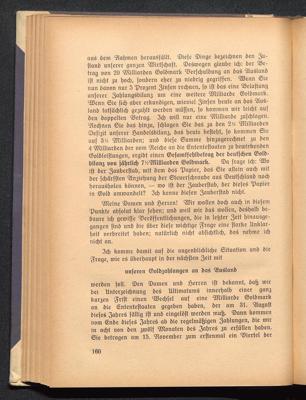 au£ bem Mahnten herausfällt. ©iefe Singe bc3cid)nen ben 3 U *ffanb unferer gan3cn < 2öirffcl)aff. ©eStoegen glaube id;: ber be-frag oon 20 97tilliarben ©olbmark Verfdjulbung an baS "SluSlanbiff nicht 3U hoch, fonbern eher 3U niebrig gegriffen. 9Benn 6ienun baoon nur 5 ^rc^enf 3infen rechnen, fo iff bas eine Belüftungunferer 3 a f)lung3bilan3 um eine roeifere ^Killiarbe ©olbmark.'iöenn Sie fich aber erkunbigen, roieuiel 3inf e n heute an baS 5lus>-lanb taffächlid) ge3at)lf roerben muffen, fo kommen mir leicht aufben hoppelten 33efrag. 3ch mill nur eine 9Killiarbe 3ufd)lagen.Rechnen Sie baS hin3u, fchlageh Sie ba£ 3U ben 2 'A 9KilliarbenS)efi3it unferer <öanbel£bilan3, baS heute beftehf, fo kommen Sieauf 3 l A 9Killiarben; unb biefe Summe hitt3ugerechnef 3U ben4 9Killiarben ber com deiche an bie (Enfenfeffaafen 3U bemirkenben(Solbleiffungen, ergibt einen ©efamtfehlbetrag ber bcuffcf)en Oolb-bilanj oon jährlich T^'JKüliarben ©olbmark. ®a frage ich: VJoiff ber 3 au t>crffab, mif bem baS 'Papier , ba£ Sie allein auch mitber fchärfffen 5ln3iet)ung ber Steuerfchraube auS ©eutfcljlanb nochherausholen können, — too iff ber 3 au bcrffab, ber biefeS Rapierin ®olb umroanbelt? 3ch kenne biefen 3 au t>crffab nicht.