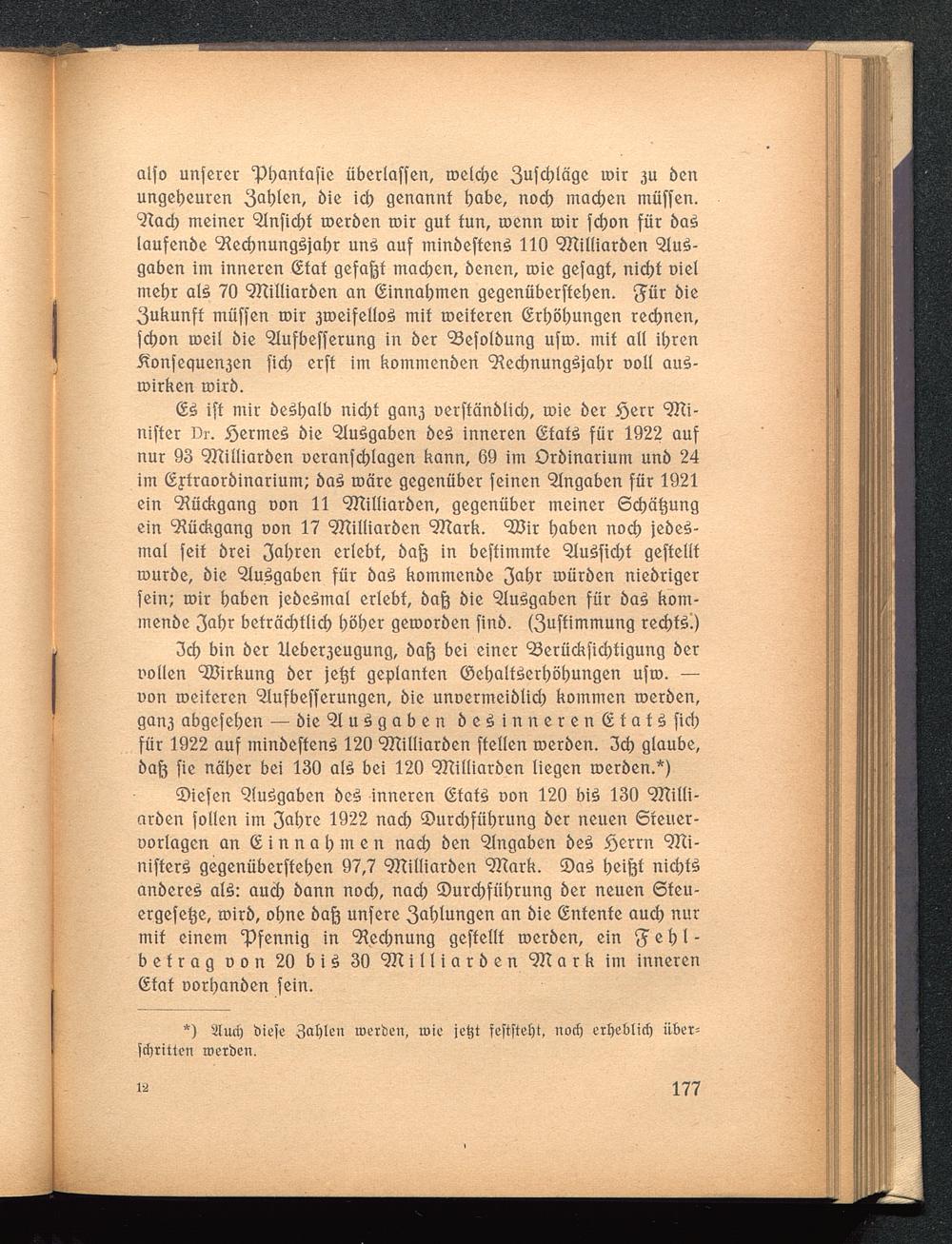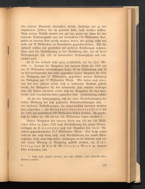 3d) bin ber lleber3eugung, baß bei einer Q3erückfid)tigung beroollen Wirkung ber jefjf geplanten ©ehaltSerhöhungen ufro. —uon roeiferen Aufbefferungen, bie unoermeiblid) kommen werben,gan3 abgefehen — bie Ausgaben besinn eren(EfafSfichfür 1922 auf minbeffenS 120 RMiarben ftellen roerben. 3ch glaube,baß fie näher bei 130 als bei 120 Rtilliarben liegen roerben.*)