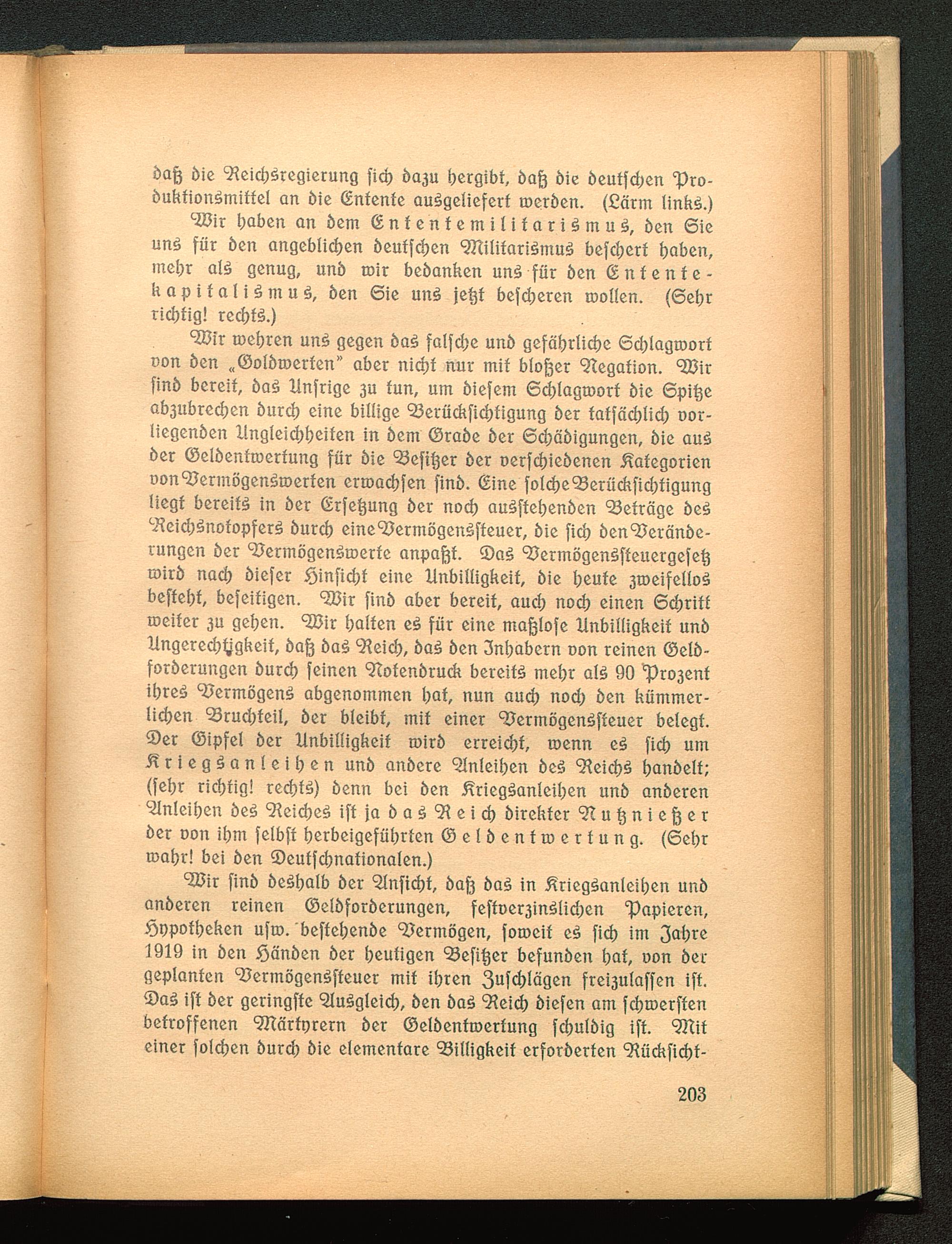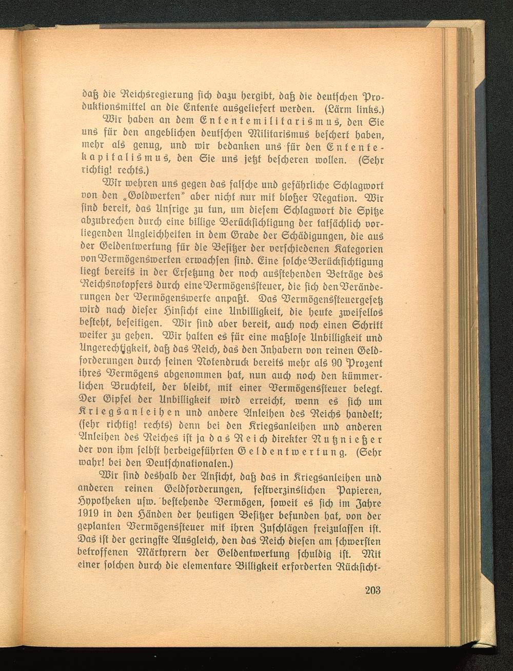 SSJir mehren unS gegen baS falfche unb gefährliche Schlagwortpon ben «©olb werten" aber nicht nur mit bloßer Negation. < 2öirfinb bereit, baS Unfrige 3U tun, um biefem Schlagwort bie Spifeeab3ubrcchen burch eine billige 93erückfichtigung ber tatfächlid; oor-liegenben Ungleid;heiten in bem ©rabe ber Sd)äbigungen, bie auSber ©elbentroertung für bie 23eftf3er ber oerfchiebenen Kategorienoon9?ermögenStDerfen ermachfen finb. (£ine folche^erückfidjtigungliegt bereite in ber ßrfetjung ber noch auSftehenben 93eträge beSc .Heid)SnotopferS burch eine93ermögenSfteuer, bie fich ben^eränbe-rungen ber BermögenSmerte anpaßt. 5)aS BermögenSfteuergefet}wirb nach biefer §infid)t eine Unbilligkeit, bie heute 3toeifelloSbefteht, befeitigen. SSJir finb aber bereit, aud; noch einen Schritttoeifer 3U gehen. < 20ir halten eS für eine maßlofe Unbilligkeit unbUngerechtigkeit, baß baS 9?eich, baS ben 3nhabern oon reinen ©elb-forberungen burd) feinen 9totenbruck bereits mehr als 90 "p^entihres Vermögens abgenommen hat, nun auch nod) ben kümmer-lichen 23rud)teil, ber bleibt, mit einer 9?ermögenSfteuer belegt.3)er ©ipfel ber Unbilligkeit toirb erreicht, wenn eS fich umKriegsanleihen unb anbere Anleihen beS Geichs hanbelt;(fehr richtig! rechts) benn bei ben Kriegsanleihen unb anberenAnleihen beS Meiches ift ja b a S 9* e i ch birekter ^u^nießerber oon ihm felbft herbeigeführten ©elbentroertung. (Sehrmahr! bei ben ©eutfchnationalen.)