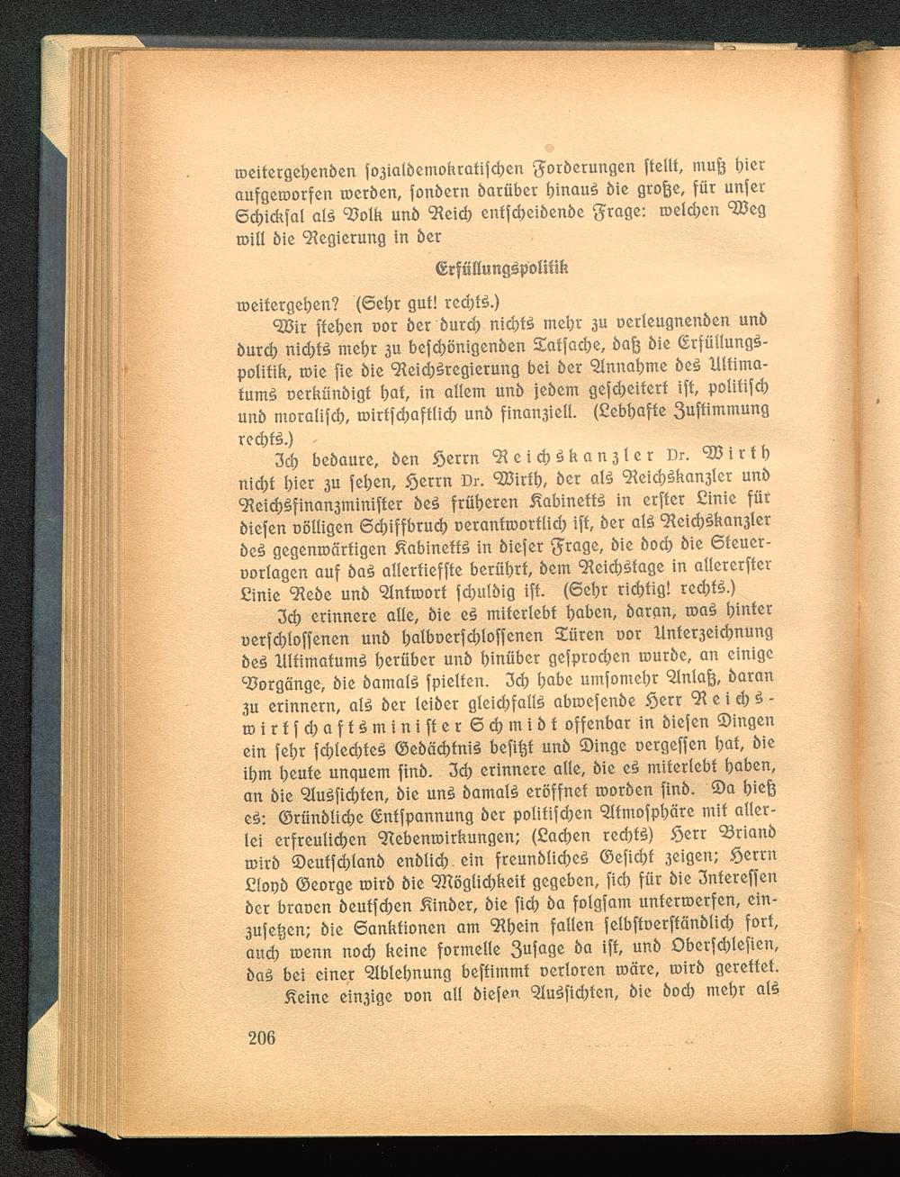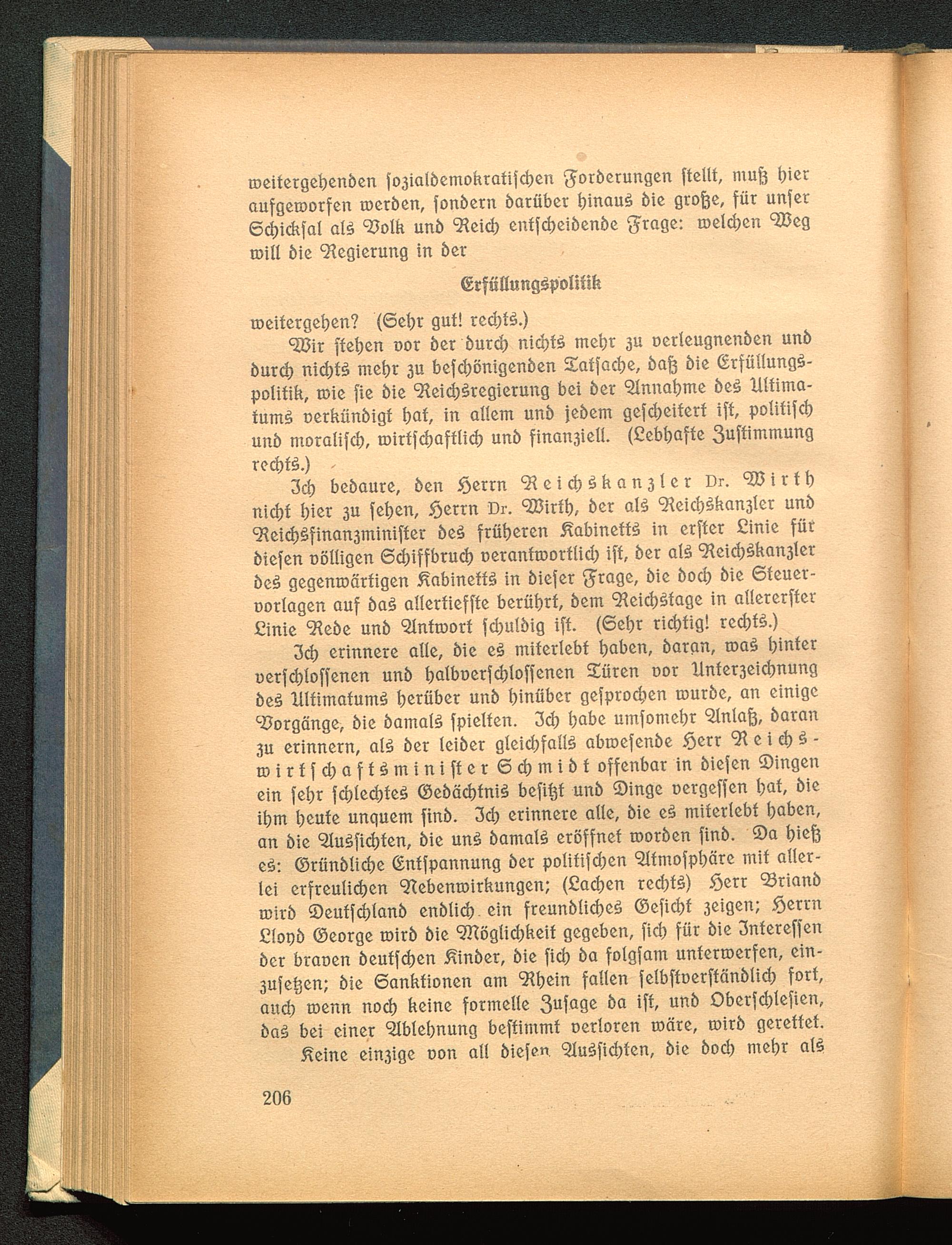 Ißir ftetjen oor 5er burd) nid)t£ mehr 3a oerleugnenben unbburch nichts? mehr 3U befdjönigenben Satfacbe, baß bie (ErfüUungS-pclitih, roie fic bie 9ieid)s>regierung bei ber Annahme beö Ulfima-tum£ cerkünbigt bat, in allem unb jebem ge}d>eiterf iff, politifcbunb moralifcb, roirffchaf flieh unb finan3iell. (Cebhaffe 3uffimmungrechts*.)