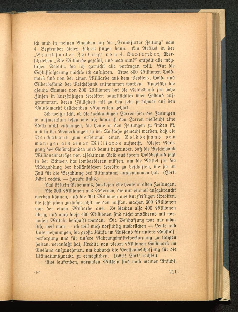 ich mid) in meinen Angaben auf öie „frankfurter 3eifung" oom4, September öiefeS 3 a fcre3 ftü^en hann. (Ein *2Irtihel in 5er„frankfurter 3 c ifuttQ" »om 4. September, über-trieben «S)ie 9Killiaröe ge3abtf, unö toa§ nun?" enthält alle mög-lichen ©etailö, 5ie id> garnidjt alle Dorfragen toill. ^tur öieSdjluftfolgerung möchte ich anführen. (Etroa 300 9Killionen ©olö-mark finö oon 5er einen ^Killiaröe au$ öem ©eoifen-, ©olö- unöSilberbeftanö öer 9?eid)^banfe entnommen rooröen. Ungefähr öiegleidje Summe oon 300 97tillionen bat 5ie 9?eid)£>bank für hohe3infen in kur3friffigen Äreöiten bauptfädjlid) über £otlanö auf-genommen, öeren fälligkeif mit 3u 5en je^t fo fd>tx>er auf öen9?alufamarkf örückenöen Momenten gebort.
