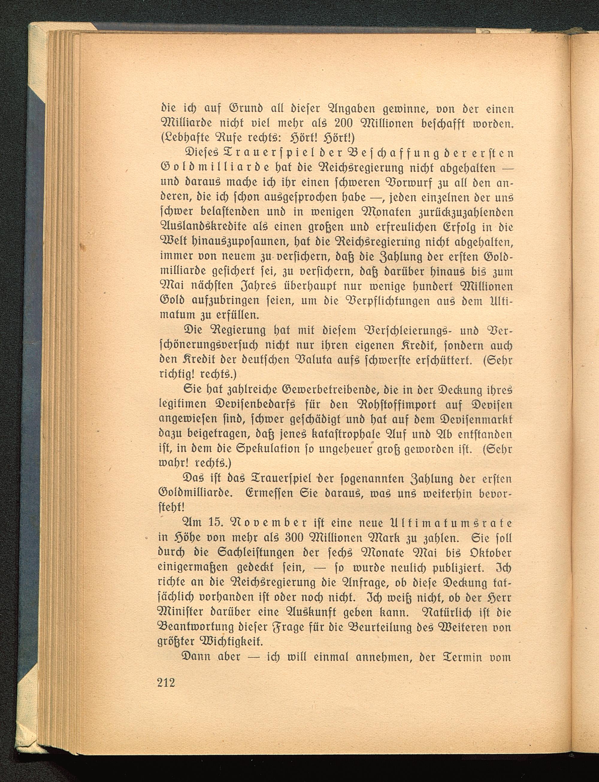 ©iefeS Srauerfpiel ber Vefchaffung ber erften© o 1 b in i 11 i a r b e t)af bie 9ieicb3regierung nicht abgehalten —unb barau$ mache id) ihr einen fdjroeren Vorrourf 3U all ben an-beren, bie id) fdjon auSgefprochen tjabe —, jeben ein3elnen ber un£fchtoer belaftenben unb in wenigen 9Ttonaten 3urück3U3ahlenben^uölanb^krebite al£ einen großen unb erfreulichen (Erfolg in biec Zßelt I)inauö3upofaunen, hat bie "Keichöregierung nicht abgehalten,immer oon neuem 3U uerfichern, baß bie 3ahlung ber erften ©olb-milliarbe gefiebert fei, 3U oerfichern, baß barüber hinauf bi3 3uin9Hai nächften 3al)re^ überhaupt nur roenige hunbert 9KiHionen©olb auf3ubringen feien, um bie Verpflichtungen au3 bem Ulti-matum 3u erfüllen.