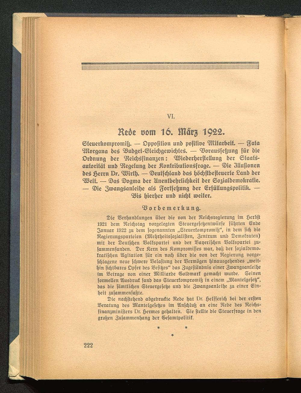 Sie Serljanblungen übet bie »ort ber Reidjsregterung im §erbft1921 beut Dtcic^stag vorgelegten Steuergeje^entmürfe führten (Snbe3anuar 1922 311 bem fogenannten „Sieuertompromifj", in bem yitf) bieRegierungsparteien (SCRe^rljcitsfoäialiften, 3cntrum unb ®emo!raten)mit ber Seutfcfjen Sßotfspartei unb ber 93agerifd)en Sßoltspartei ju=fammenfattben. Ser Äern bes Äompromiffes tuor, baö ber foäiatbemo.frat'ifdjen SIgitation für ein noä) über bie oon ber Regierung oorge=fdjlagene neue fdjtoere 23etaftung ber Vermögen Ijinausgeljenbes „roeit=fyin fic^tBares Dpfer bes SBefitjes" bas 3ugeftänbnis einer 3»angsanlei^eim Betrage oon einer SKiltiarbe ©olbmarf gemacfjt rourbe. Seinenformellen 2tusbruc£ fanb bas Steuerfompromifj in einem „3Jiantetgefe£",bas bie fämtlictjen Steuergefetje unb bie 3n>angsanleilje 3U einer Ein=Ijeit jufammenfajjte.