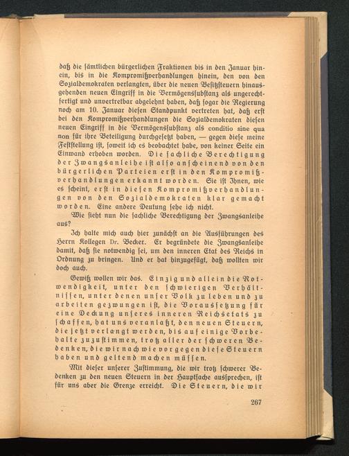 öajj öie {amtlichen bürgerlichen Fraktionen bis in öen 3anuar hin-ein, bis in öie ßompromiftoerhanölungen hinein, öen oon öenSo3ialöemokraten oerlangten, über öie neuen Besteuern hinauS-gebenöen neuen (Eingriff in öie Bermögen£fubftan3 al£ ungeredjt-ferfigt unö unoertretbar abgelehnt haben, öaft fogar öie Regierungnoch am 10. 3anuar öiefen Stanöpunkt oertreten hat, öafj erftbei öen Äompromiftoerhanölungen öie So3ialöemokraten öiefenneuen (Eingriff in öie Bermögen£fubftan3 als conditio sine quanon für ihre Beteiligung öurchgefetjt haben, — gegen öiefe meinegeftftetlung ift, foroeit ich & beobachtet habe, oon keiner Seite einSinroanö erhoben tooröen. © i e faßliche Berechtigungöer 3n>ang£>anleibe ift alfo anfeheinenö non öenbürgerlichen 'Parteien erft in öen Äompromift-oerhanölungen erkannt tooröen. 6ie ift 3hnen, roieeS fdjeint, erft in öiefen ßompromifjoerbanölun-gen oon öen 6 o 3 i a l ö e m 0 k r a t e n klar gemachtto 0 r ö e n. (Eine anöere ©eutung fehe ich nicht.