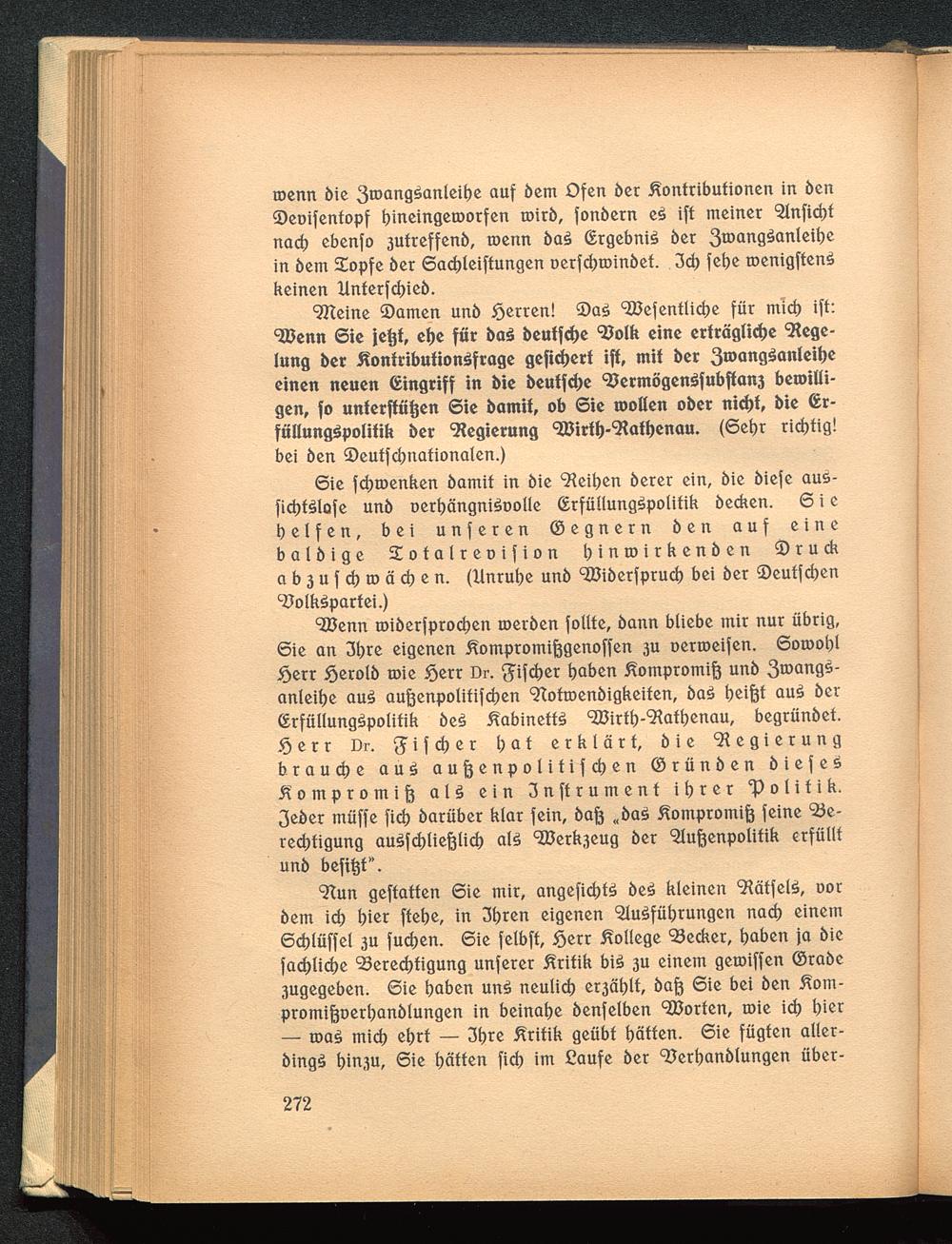 RJenn roiberfproeben roetben follte, bann bliebe mir nur übrig,Sie an 31>re eigenen Kompromißgenoffen 3U oerroeifen. Soroobl£err §ßtolb roie ^err Dr. ffifcher haben Kompromiß unb 3 TOQ ngs-anleitje au§ außenpolitifd)en Rotroenbigkeiten, ba3 beißt au£ ber(Erfüllungöpolitik be£ Kabinette RJirtb-Ratbenau, begrünbet.9) e r r Dr. ^ i f ch e r bat erklärt, bie Regierungbrauche a u 3 außenpolitifeben ©rünben b i e f e sKompromiß aU ein 3nftrument ihrer 'Politik.3eber müffe fid> barüber klar fein, baft <( ba£ Kompromiß feine Be-rechtigung au£fcf)ließlicb als RJerk3eug ber Außenpolitik erfülltunb befitjt".