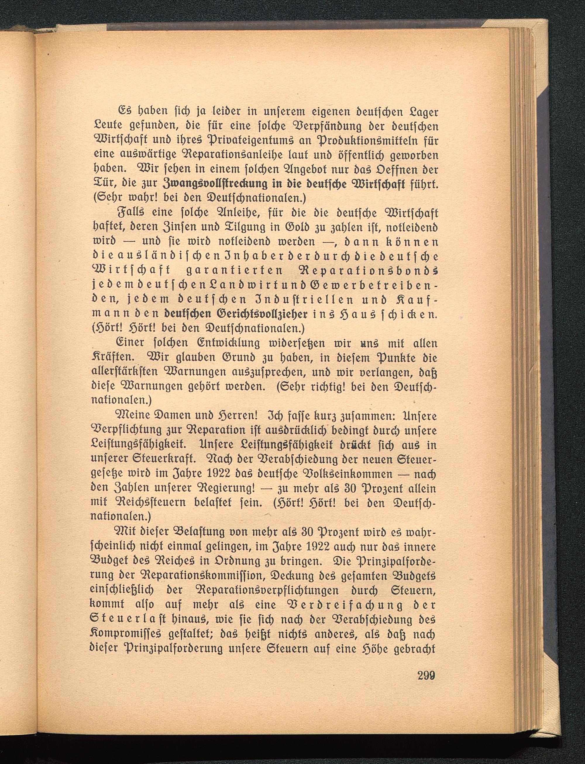 Rteine ©amen unb iöerren! 3ch faffe kur3 3ufammen: UnfereVerpflichtung 3ur Reparation ift auäbrücklid) bebingt burd) unfereCeiftungSfähigkeit. Hnfere CeiftungSfähigkeit brückt fid) au$ inunferer ©teuerkraft. Rad) ber Verabfd)iebung ber neuen ©teuer-gefetje roirb im 3<*hte 1922 ba£ beutfdje Volkseinkommen — nad)ben 3<*hlen unferer Regierung! — 3U mehr al£ 30 ^^ent alleinmit Reicf)3ffeuern belaftet fein. (ioört! i$örf! bei ben ©eutfch-nationalen.)