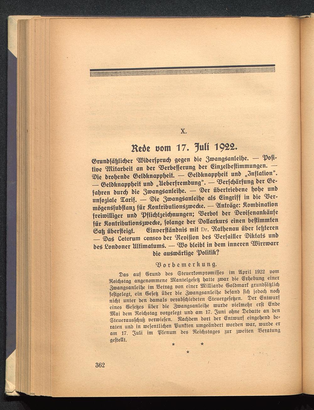 Das auf ©runb bes Steuerfompromiffes im Stpril 1922 oomSReiidjstag angenommene 2Jtantelgefeö Ijatte smar bie ©rljebung einer3mangsanlei§e im Settag oon einet 9ttiltiarbe ©olbmarf grunbfätjlid)festgelegt, ein ffiefet; über bie 3®ang5antei|e befanb fidj jebodj nodjnidjt unter ben bamats oetabfdjiebeten Steuergefetjen. Set ßntxourfeines ©efetjes über bie 3mattgsanteil)e routbe oielmeljr erft GnbeSDTai bem 3leidjstag oorgelegt unb am 17. 3uni o^ne Debatte an ben6teuetausfdjuj3 oerroiefen. ÜTCactjbem bort ber ©nttourf eingeljenb be=taten unb in roefentlidjen fünften umgeänbert roorben mar, tourbe eram 17. im Plenum bes Reichstages sur jroeiten Beratung