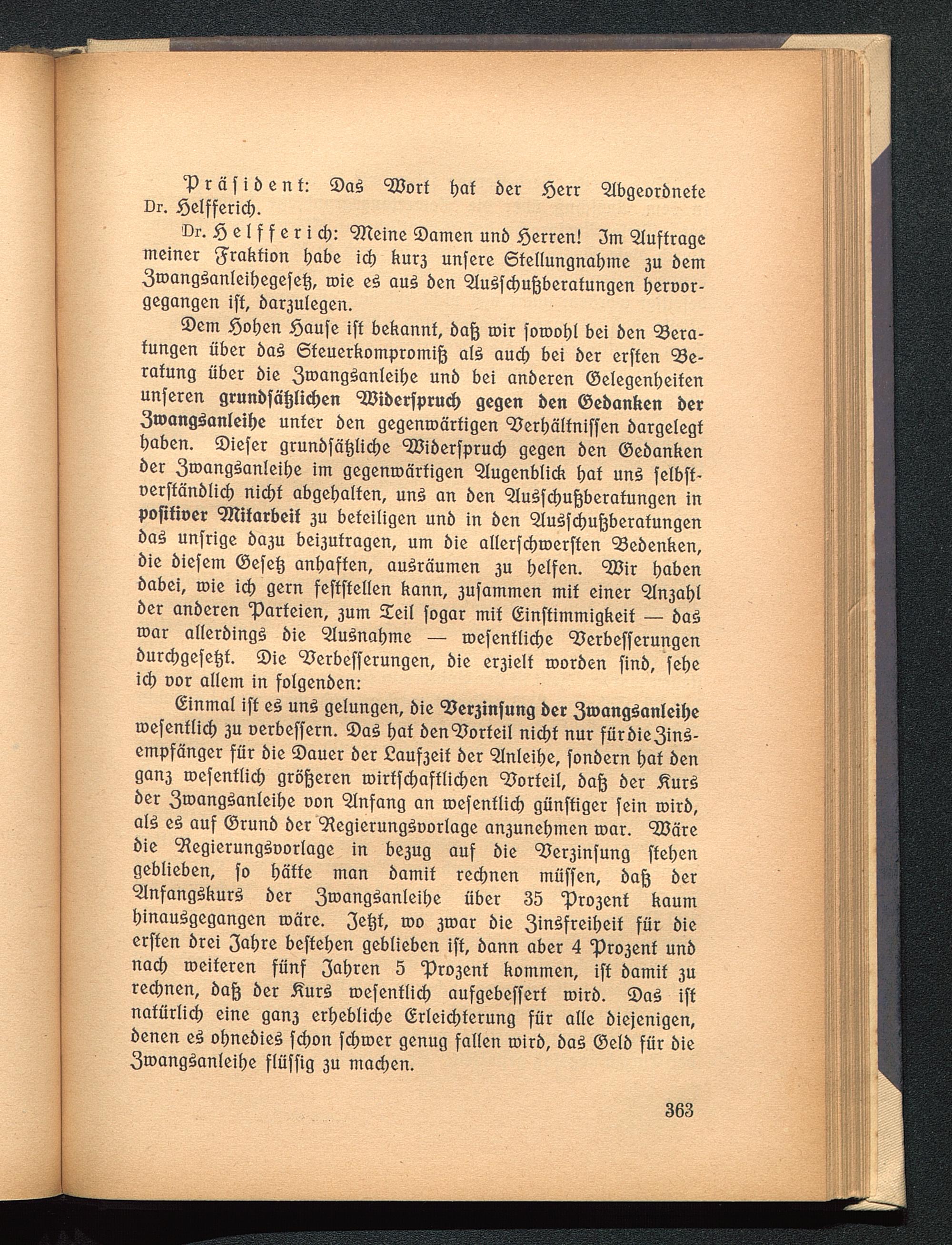 (Einmal ift e£ un£ gelungen, bie Bet3infung ber 3t»ang3anleif)eroefentlid) 3U nerbeffern. 5)a£ t>at benBorfeil nicfjf nur fürbie3in<>-empfänger für bie Sauer ber £auf3eif ber Anleihe, fonbern hat bengan3 roefenflicb größeren tDirffdjafflid>en Borteil, baß ber £ur£ber 3 roa ng3anleibe oon Anfang an roefentlid) günftiger fein roirb,als e£ auf ©runb ber 9?egierung^üorlage an3unebmen roar. B3ärebie ^Regierungsvorlage in be3ug auf bie Beqinfung ffebengeblieben, fo bätte man bamif reebnen müffen, baß berAnfangSkurS ber 3 roa ng3anleibe über 35 c Pro3ent kaumhinaufgegangen roäre. roo 3roar bie 3i n 3fteihert für &ie