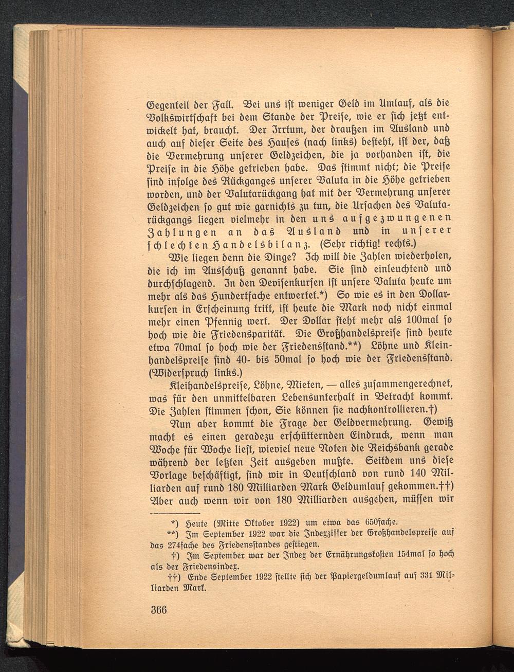 SBJie liegen benn bie S)inge? 3cf) roill bie 3ablen roieberl)olen,bie id) im Sluöfcfjufe genannt ^abe. 6ie finb einleudjfenb unbburd)fd)lagenb. 3n ben ©eoifenkurfen iff unfere Valuta beute ummebr aB ba£ <öunöerffad)e enfroerfef.*) 60 roie e£ in ben ®ollar-kurfen in Srfcbeinung tritt, iff beute bie 9Hark noch nicf)f einmalmehr einen "Pfennig roerf. ©er Sollar ffehf mehr al§ lOOmal fobod) roie bie grieöenSparifäf. $>ie (Srofthanbelöpreife finb beuteefroa 70mat fo \)od) roie ber $rieöem>ffanö.**) £öhne unb £lein-banöelöpreife finb 40- bi£ 50mal fo bod) roie ber griebenSffanö.(VJiöerfprucb links».)