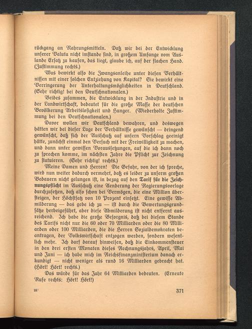 9Heine ©amen unb iöerren! ©ie ©efabr, oon ber icb fpredje,toirb nun roeifer babureb oermebrf, baß e£ leiber 3U unferm großenVebauern nidjf gelungen iff, in be3ug auf ben STarif für bie 3*id)-nungSpflicfjf im "2lu£fcbuß eine $lenberung ber Regierungsvorlageburd)3ufe§en, baß alfo febon bei Vermögen, bie eine 9Hillion über-ffeigen, ber ioöcbfffafj t>on 10 "p^enf einfefjf. ©ine geroiffe 21b-milberung — baö gebe id) 3U — iff burd) bie VeroerfungSgrunb-fäfje t)crbeigefüt)rf, aber biefe 5lbmilberung ift nid)t entfernt au£-reiebenb. 3d) babe bie große Veforgnis», baß bei biefem 6fanbebe§ Sarifj) niebt nur bie 60 ober 70 'SHilliarben ober bie 80 ^Killi-arben ober 100 'SHilliarben, bie bie Serren 0O3ialbemokraten be-antragen, ber Volkskoirtfcbaft ent3ogen toetben, fonbern roefenf-lid> mebr. 3cb barf barauf binroeifen, baß bie (Einkommenfteuerin ben brei erften Monaten biefeö Rechnungsjahrs, SIpril, 9Kaiunb 3uni — id) babe mieb im ^eid)öfinan3minifterium banad) er-kunbigt — nid)f meniger als» runb 16 92Miarben gebracht bot-(iöörf! iöört! rechte.)