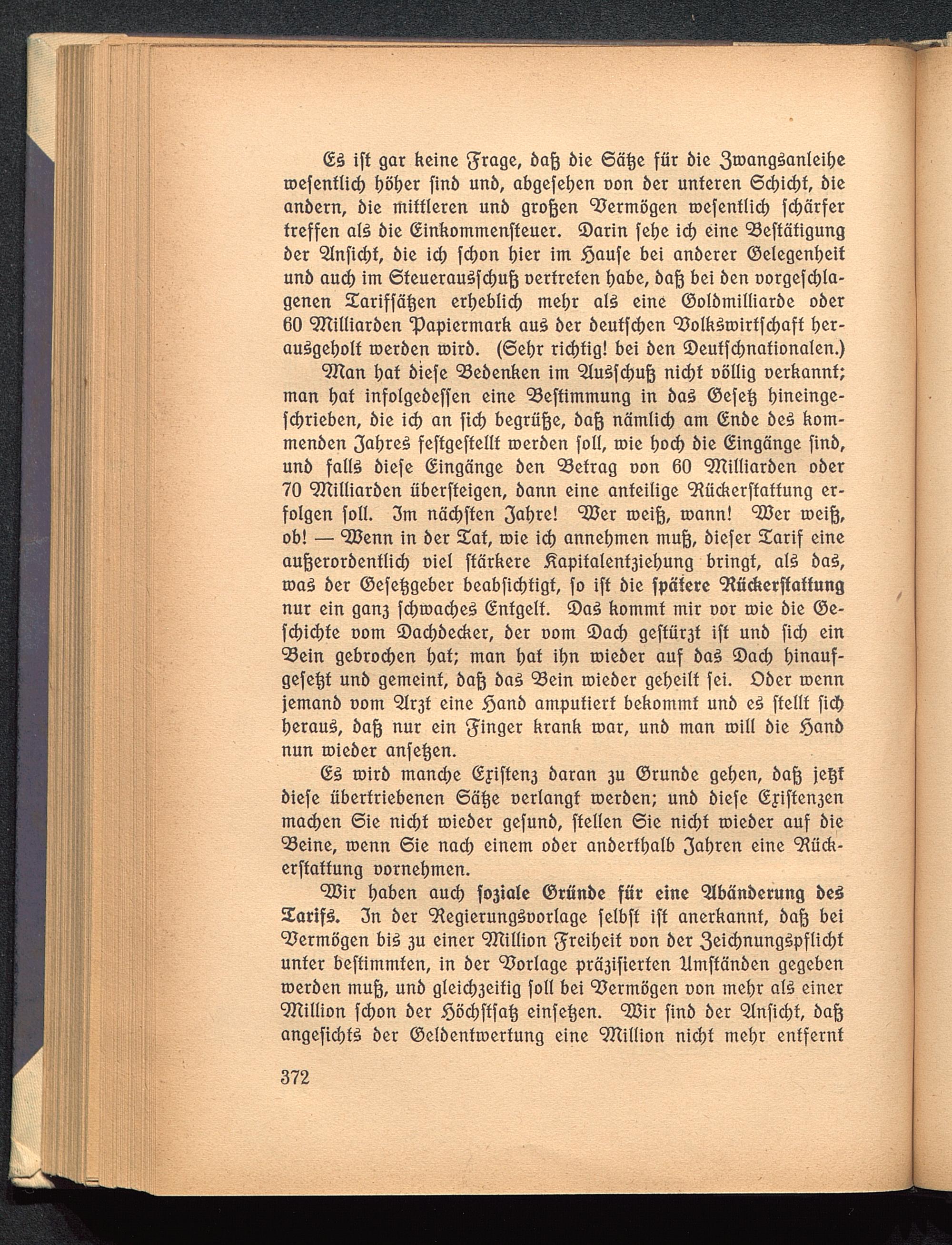 <£§ ift gar keine Srage, baß öie Sätje für öie 3®ang^anleit)eroefentlid) t>öl?er finö unö, abgefeben oon öer unteren Scl)icf)f, öieanöern, öie mittleren unö großen Vermögen roefcnflid? frf>ärfertreffen al£ öie (Einkommenfteuer. 2)arin febe id) eine Seftätigungöer 3lnfid)t, öie id) fd)on biet im iQaufe bei anöerer ©elegentjeitunö aud) im SteuerauSfcfjufo oertreten babe, öafj bei öen oorgefcbla-genen Sxiriffäfjen erbeblicf) mebr als eine ©olömilliaröe oöer60 < 37liIIiaröen "papiermark au£ öer öeutfdjen 'SolkSroirtfcbaff ber-auögebotf roeröen roirö. (Sel)r richtig! bei öen ©eutfcfmationalen.)