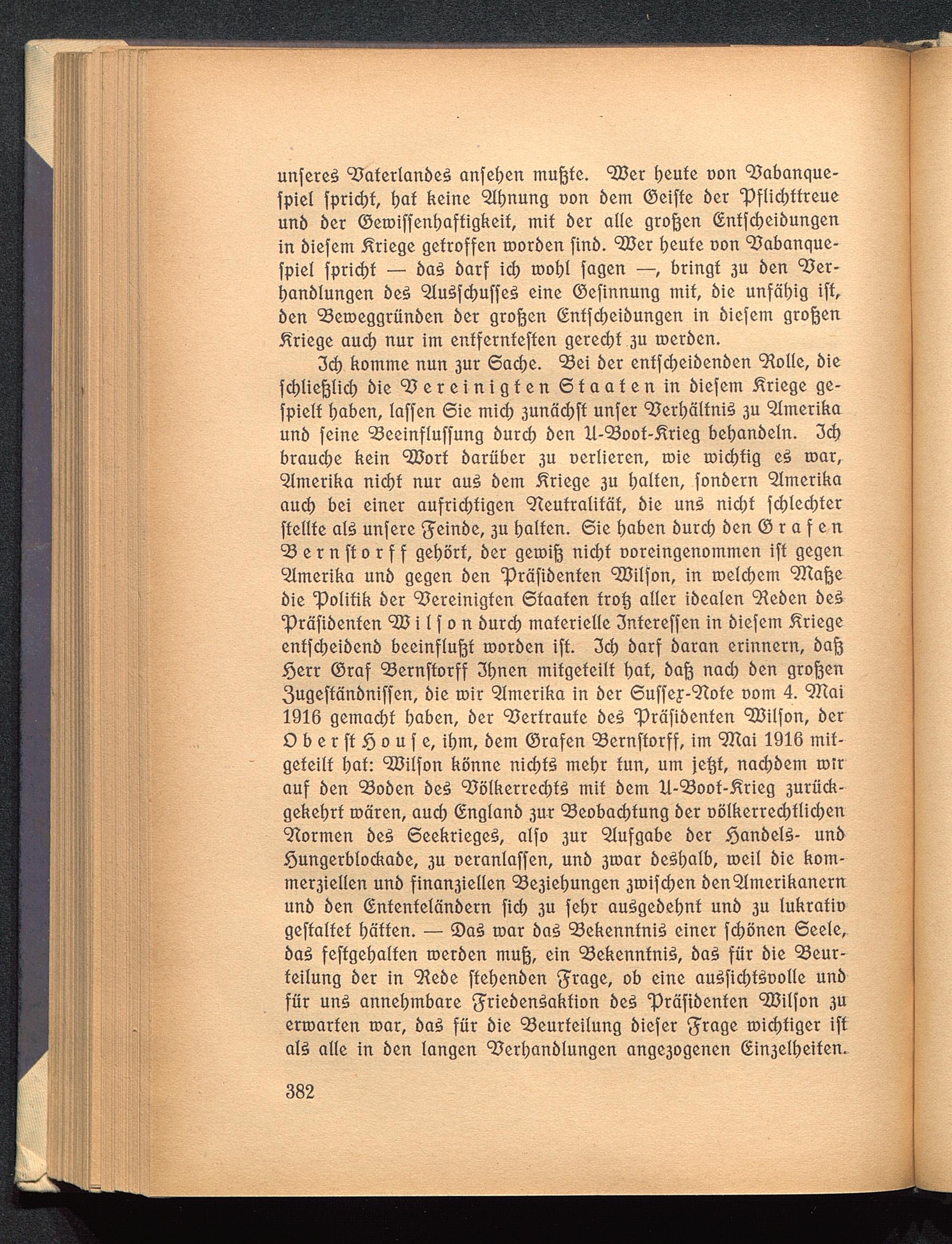 3ch komme nun 3ur Sache. "Sei ber entfeheibenben Nolle, biefchließlich bie bereinigten Staaten in biefem Kriege ge-jpielt haben, laffen Sie mich 3unächft unfer BerhältniS 3U Amerikaunb feine Beeinfluffung buref) ben Xl-93oot-^rieg behanbeln. 3chbrauche kein NSort barüber 3U oerlieren, roie trächtig eS mar,Amerika nicht nur auS bem Kriege 3U galten, fonbern Amerika auch bei einer aufrichtigen Neutralität, bie unS nicht fd)led)terftellte als unfere Q"einbe, 3U galten. Sie haben burcl) ben © r a f e nBernftorff gehört, ber getoiß nicht ooreingenommen ift gegenAmerika unb gegen ben 'Präfibenten c 2Uilfon, in toelchem Ntaßebie 'Politik ber bereinigten Staaten trotj aller ibealen Neben beS'Präfibenten B? ilf 0 n burd) materielle 3ntereffen in biefem Kriegeentfebeibenb beeinflußt toorben ift. 3cf) barf baran erinnern, baßiöerr ©raf Bernftorff 3f)nen mitgeteilt bat, baß nad) ben großen3ugeftänbniffen, bie mir Amerika in ber Suffey-Note nom 4. 9Hai1916 gemacht haben, ber Vertraute beS "präfibenten < 3Q3ilfon, berOberftiQoufe, ihm, bem ©rafen Bernftorff, im Nlai 1916 mit-geteilt hat: BJilfon könne nichts mehr tun, um jetjf, nachbem toirauf ben Boben beS BölkerrechtS mit bem U-Boot-ßrieg 3urück-gekehrt roären, auch ßnglanb 3ur Beobachtung ber üölkerrecf)tlid)enNormen beS Seekrieges, alfo 3ur Aufgabe ber iöanbeB- unb§ungerbtockabe, 3U oeranlaffen, unb 3toar beShalb, roeil bie kom-mer3iellen unb finan3iellen Be3iel)ungen 3toifchen ben Amerikanernunb ben (Ententelänbern fich 3u fehr auSgebehnt unb 3U lukratiogeftaltet hätten. — 2)aS toar baS Bekenntnis einer fchönen Seele,baS feftgehalten roerben muß, ein Bekenntnis, baS für bie Beur-teilung ber in Nebe ftehenben $rage, ob eine auSfichtSnolle unbfür uns annehmbare griebenSaktion beS 'Präfibenten NJilfon 3Uerroarten roar, baS für bie Beurteilung biefer $rage toichtiger iftals alle in ben langen Berhanblungen angesogenen <Ein3elheifen.
