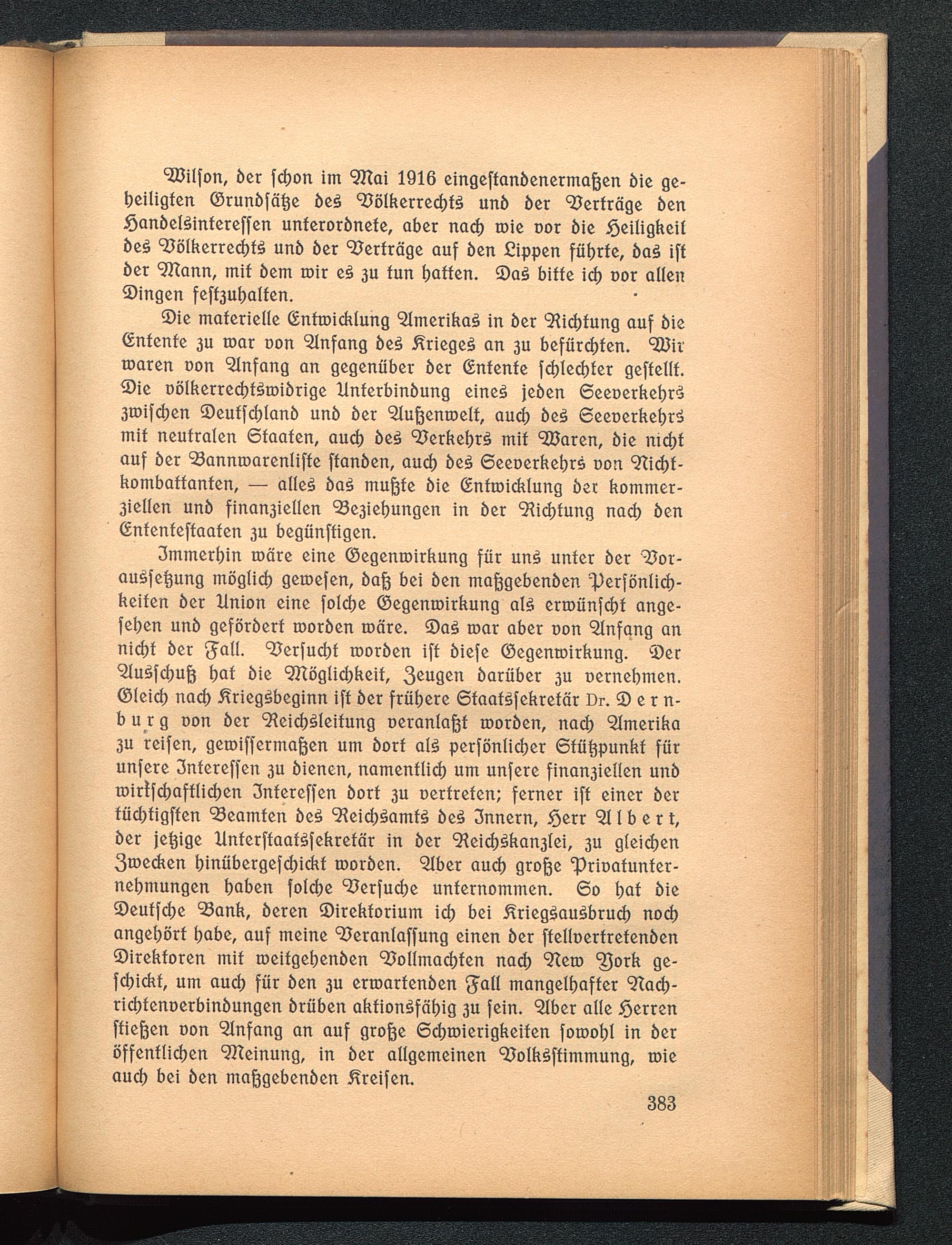 3mmerhin roäre eine ©egenroirkung für unS unter ber Vor-auSfeftung möglich geroefen, baß bei ben maßgebenben ^Perfönlich-keiten ber Union eine folche ©egenroirkung als erroünfcht ange-fehen unb geförbert roorben märe. ®aS roar aber oon Anfang annicht ber gall. 9?erfucht roorben ift biefe ©egenroirkung. ©er"SluSfchuß hat bie Möglichkeit, 3 cu 9 en barüber 3U vernehmen.Oleich nach Kriegsbeginn ift ber frühere Staatssekretär Dr. S e r n-burg oon ber NeicbSleifung ueranlaßt roorben, nach Amerika3U reifen, geroiffermaßen um bort als perfönlicher ßtütjpunkt fürunfere 3ntereffen 3U bienen, namentlich um unfere finan3iellen unbroirlfchaftlichcn 3nfereffen bort 3U oertreten; ferner ift einer berfücbtigffen Beamten beS NeichSamtS beS 3nnern, Serr 511 b e r t,ber jetjige UnterftaatSfekretär in ber 9teicf)Skan3lei, 3U gleichen3roecken hiuübergefchickt roorben. 3lber auch große c Prioatunter-nehmungen haben folche Verfuche unternommen. 60 hat bieSeutfdje 93ank, beren ^Direktorium ich bei Kriegsausbruch nochangehört habe, auf meine Veranlaffung einen ber ftelloertretenben^Direktoren mit roeitgehenben Vollmachten nach Nero ^ork ge-fchickt, um auch für ben 3U erroartenben $all mangelhafter 9tach-richtenoerbinbungen brühen aktionsfähig 3U fein. ^Iber alle Herrenftießen oon Einfang an auf große 6chroierigkeifen foroohl in beröffentlichen Meinung, in ber allgemeinen VolkSftimmung, roieauch bei ben maßgebenben Kreifen.