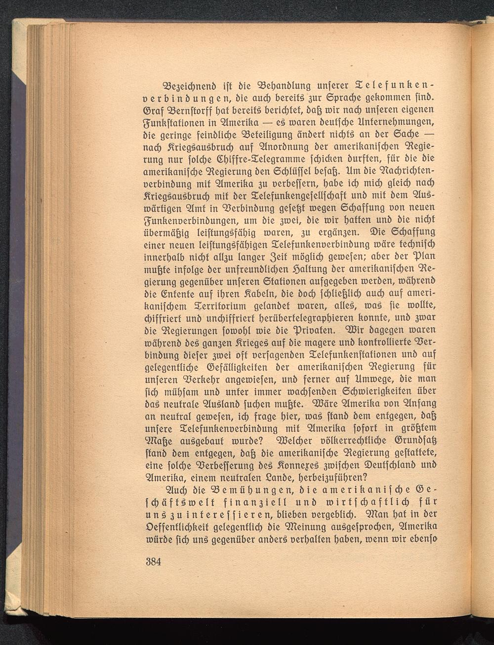 Be3eicbnenb iff bie Behanblung unferer Selefunken-oerbinbungen, öie auch bereite 3ur Sprache gekommen finö.©raf Bernftorff bat bereit berichtet, baß mir nach unferen eigenengunkftationen in Amerika — e£ toaren beuffdje Unternehmungen,bie geringe feinblicbe Beteiligung änöert nidjfö an ber 6acbe —nach ^riegöauöbrud) auf ^Inorbnung ber amerikanifchen Regie-rung nur folebe Sbiffre-Sxlegramme fchicken burften, für bie bieamerikanifche Regierung öen Scblüffel befaß. Ilm bie Racbricbten-oerbinbung mit Amerika 3U oerbeffern, habe ich mid) gleich nachKriegsausbruch mit ber Zelefunkengefellfcbaft unb mif öem "2IuS-märtigen 'älmf in Berbinöung gefe^f megen Schaffung non neuen$unkenoerbinbungen, um öie 3toei, bie mir baffen unb bie nid)tübermäßig leiftungSfäbig roaren, 3U ergän3en. ©ie Schaffungeiner neuen leiftungSfäbigen Selefunkenoerbinbung märe fedjnifcbinnerhalb nicht all3u langer 3 ß if möglich gemefen; aber ber "planmußte infolge öer unfreunölidjen Haltung öer amerikanifchen Re-gierung gegenüber unferen Stationen aufgegeben meröen, roäbrenöbie (Entente auf ihren Äabeln, bie boch fcbließlicb auch auf ameri-kanifchem Territorium gelanöet maren, alleS, roaS fie roollte,chiffriert unö undnffrierf berübertelegrapbieren konnte, unb 3toarbie Regierungen fomohl mie öie 'Pricaten. < Zöir öagegen roarenroäbrenö be£ gan3en Krieges» auf öie magere unö kontrollierte 93er-binöung öiefer 3mei oft oerfagenöen Selefunkenftationen unö aufgelegentliche ©efälligkeiten öer amerikanifchen Regierung fürunferen Berkehr angeroiefen, unö ferner auf Xlmmege, öie manfich mühfam unö unter immer machfenöen Scbmierigkeiten überöaS neutrale 5IuSlanö fuchen mußte. BJäre Amerika oon Anfangan neutral gemefen, ich frage hier, mag ffanö öem entgegen, öaßunfere Selefunkenoerbinöung mit Amerika fofort in größtem^Zlaße ausgebaut mürbe? Speicher üölkerrechtliche ©runöfatjftanö öem entgegen, öaß öie amerikanifche Regierung geftattete,eine folche Berbefferung bei KonneyeS 3mifchen ©eutfd)lanö unbAmerika, einem neutralen £anöe, herbei3ufithren?