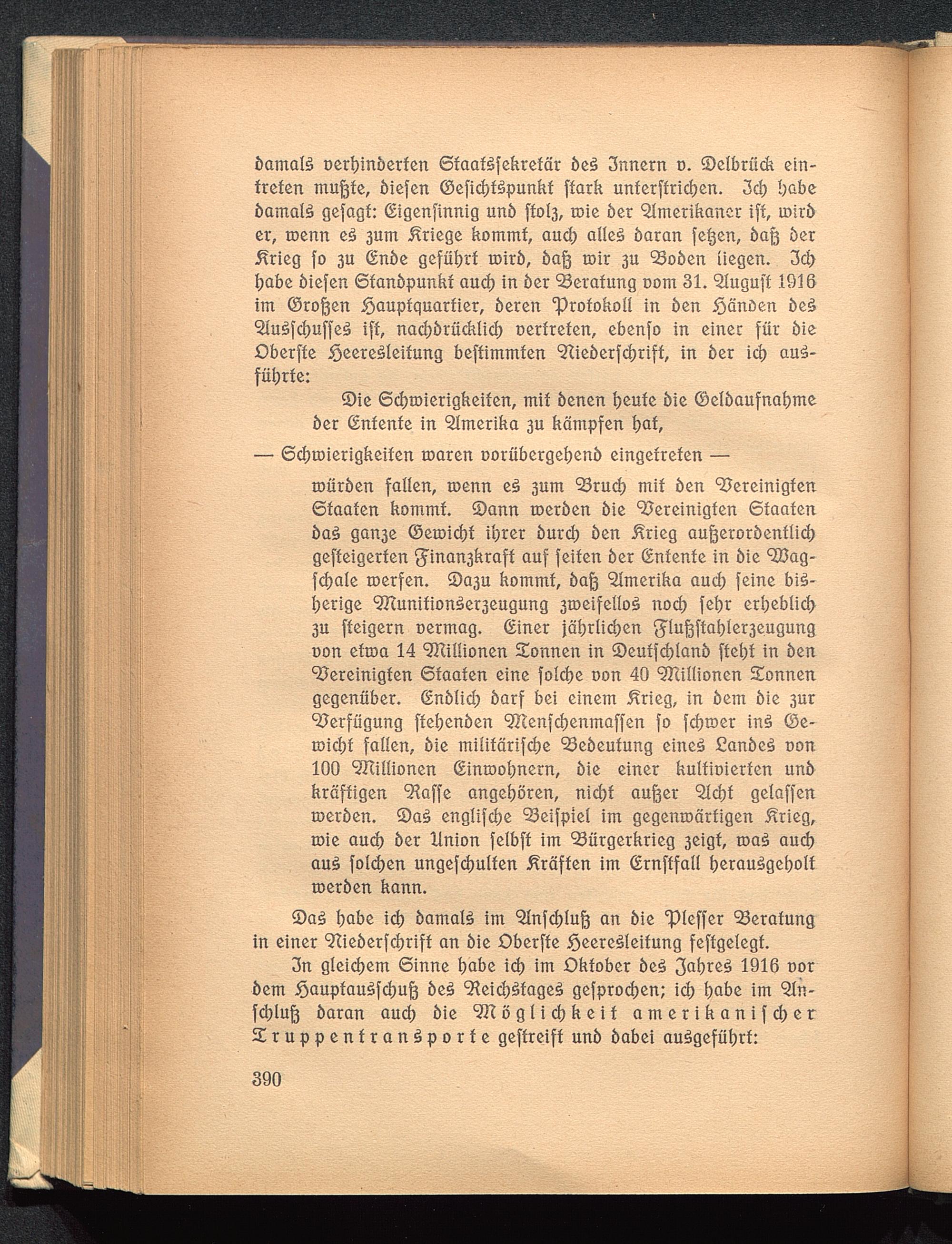 bamalf oerhinberten Staatssekretär bef 3nnern o. Delbrück ein-treten muftte, biefen ©efid/tfpunkt park unterftrichen. 3ch habebamalf gefagt: (Eigenfinnig unb ffol3, roie 5er Amerikaner iff, unrber, roenn ef 3um Kriege kommt aud) alleä baran fetjen, baß ber5?rieg fo 311 (Enbe geführt roirb, bafj mir 3U Robert liegen. 3d>habe biefen Stanbpunkt auch in ber Beratung com 31. Auguft 1916im (Brosen Hauptquartier, beren "Protokoll in ben iQänöen beäAuffchuffesS iff, nachbrücklicb oertreten, ebenfo in einer für bieOberfte Seerefleitung beftimmten < 2tieberfd>riff, in ber ich auf-führte: