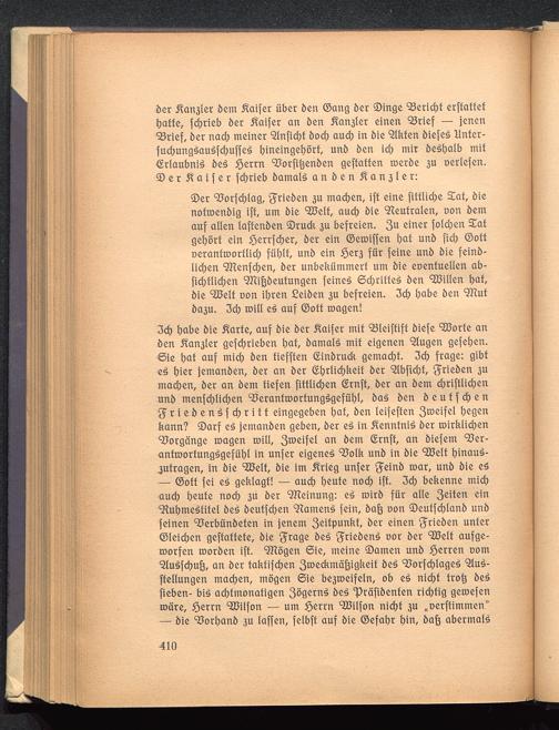 3cb babe bie Äarfe, auf bie ber ^aifer mif 93leiffift biefe SQJorfe anben ^an3ler gefcbrieben baf, bamal<> mif eigenen klugen gefeben.Sie bat Q uf micb ben fiefffen Csinbruck gemacbf. 3cb frage: gibte3 bißt jemanben, ber an ber ©brticbkeif ber "Slbficbt, ^rieben 3Umadjen, ber an bem tiefen fittlicben Srnft, ber an bem cbriftlicbenunb menfcblidjen ^eranfroorfungSgefübl, ba£ ben b e u f f cb e ngriebenSfcbriff eingegeben bat, ben leifeffen 3roeifel begenkann? ©arf e£ jemanben geben, ber e3 in Kenntnis ber wirklichenVorgänge roagen roill, 3roeifel an bem (Ernft, an biefem 9?er-anfroortungögefübl in unfer eigenes» 9?olk unb in bie SQJelf binauS-3utragen, in bie SSZJelf, bie im ^rieg unfer ^einb roar, unb bie eS