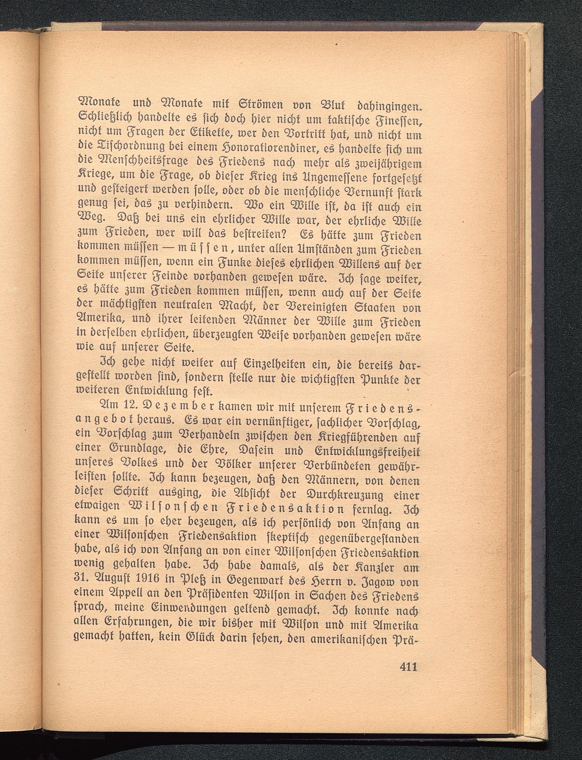 3lm 12. 3 e 3 e m b e r kamen roir mit unferem $rieben3-a n g e b o f berauö. £3 toar ein oernitnffiger, fad)Iid?er 9?orfcblag,ein c £orfd)lag 3um berbanbeln 3toifd;en ben ^riegföbrenben aufeiner ©runblage, bie (zfyxz, ©afein unb (£nfu>icklung£freit)eifunfereS 9?olke£ unb ber Kölker unferer 9}erbünbeten getuäbr-leiffen follfe. 3d; kann be3eugen, bafj ben Sönnern, oon benenbiefer Sd?riff ausging, öie Qlbfidjf ber S)urd)kreu3ung einerefroaigen < 22? ilfonf d>en griebenSaktion fernlag. 3cl)kann e3 um fo eber be3eugen, aB id) perfönlicb oon Anfang aneiner 'Jßilfonfcben griebemSakfion fkepfifd) gegenübergeftanbenbabe, als id; oon Einfang an oon einer ^ilfonfcben griebenSaktionroenig gehalten babe. 3cl) babe bamaB, als ber 5?an3ter am31. ^uguff 1916 in 'Plejj in ©egentoarf be£ ifterrn o. 3 a Qoto ooneinem Appell an ben 'präfibenten Hilfen in Sachen bes. griebenSfpracb, meine (Einroenbungen gelfenb gemadjt. 3cf) konnte nachallen (Erfahrungen, bie roir biäbcr mit 923ilfon unb mif Amerikagemacht l;atfen, kein ©lück barin feben, ben amerikanifd;en "prä-