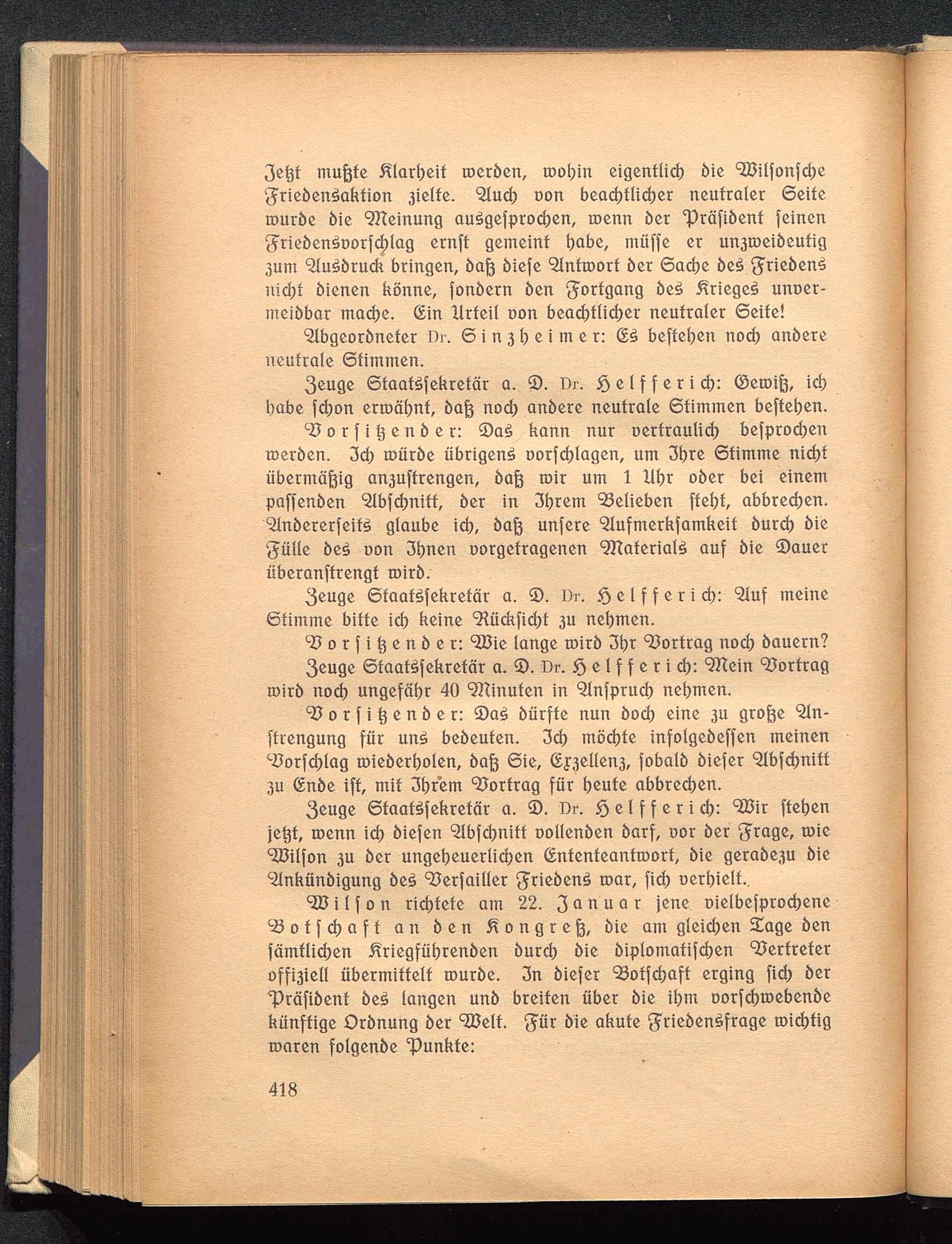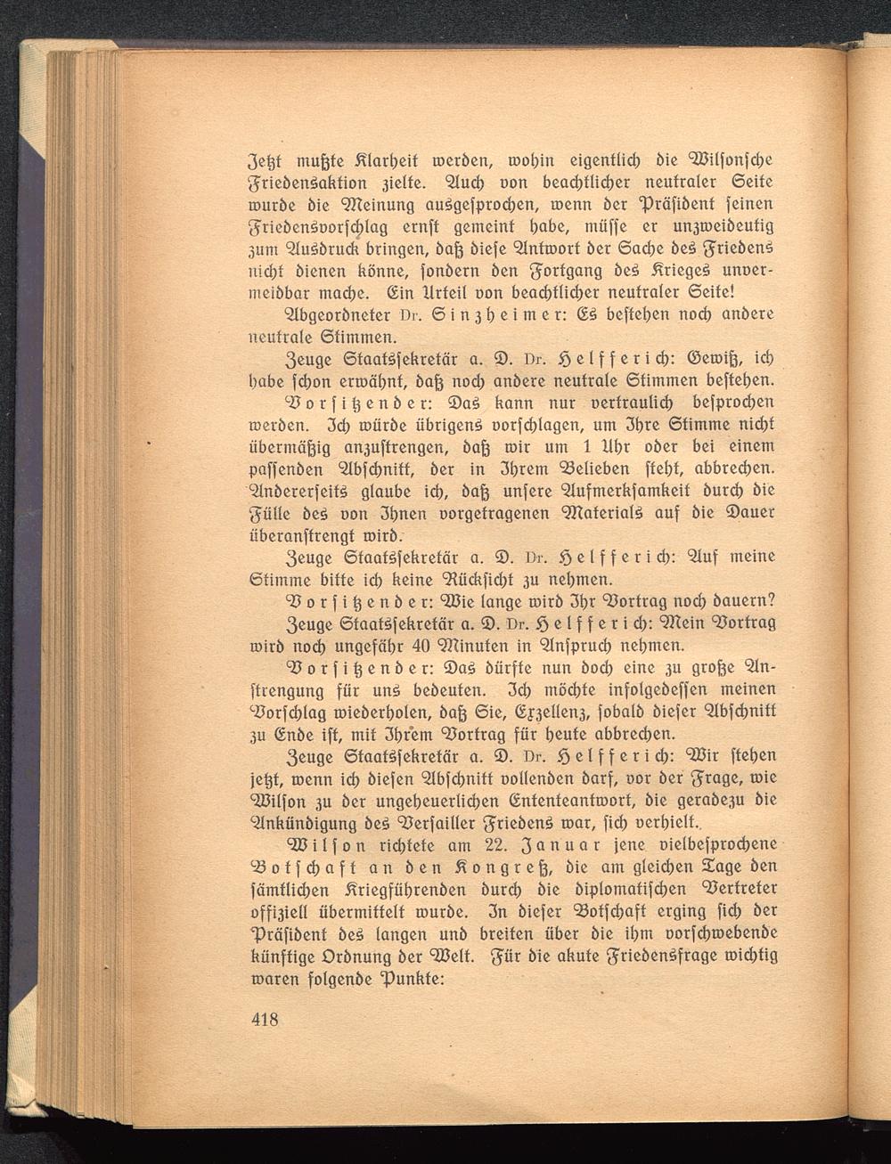 3euge Staatssekretär a. 2). Dr. £ e l f f e r i d): 'Zßir flehenjetjt, roenn id) biefen 5lbfcl)nift oollenben barf, uor ber Srage, roieSLÖilfon 3U ber ungeheuerlichen Ctnfenfeanfroorf, bie gerabe3u biec 2lnkünbigung be£ 9?erfailler SriebenS mar, fich oerhielt..