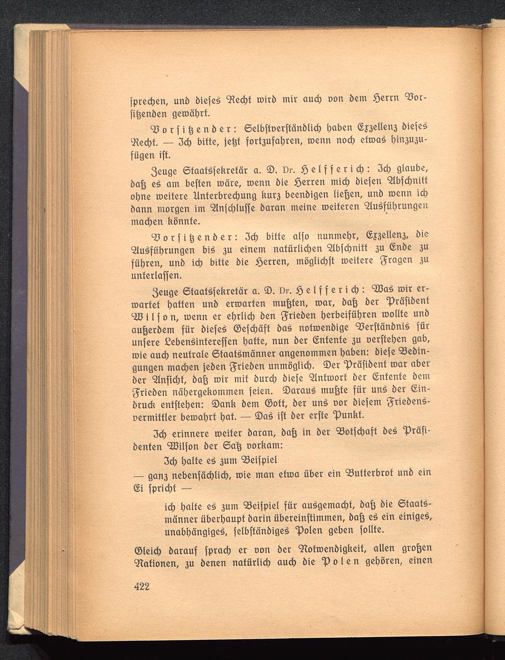 3euge ©taatSfekretär a. 2). Dr. Jfj e l f f e r i ch : 'JßaS ioir er-wartet hatten unö erwarten mußten, roar, baß öer "präfiöentc 2öi l f o n, roenn er ehrlich ben ^rieben herbeiführen toollfc unöaußerbem für biefeS ©efd)äff baS notroenöige 9?erftänbniS fürunfere £ebenSintereffen hotte, nun öer (Entente 3U oerftehen gab,roie aud) neutrale Staatsmänner angenommen haben: öiefe 93ebin-gungen machen jeöen ^rieben unmöglich. ®er "präfiöent roar aberöer 5lnftd;t, baß mir mit öurch öiefe Antwort öer (Entente öem^rieben nähergekommen feien. Saraus mußte für unS öer (Ein-bruch entftehen: Sank bem ©off, ber unS cor biefem griebenS-uermittler bewahrt hat. — ®aS ift ber erfte 'Punkt.