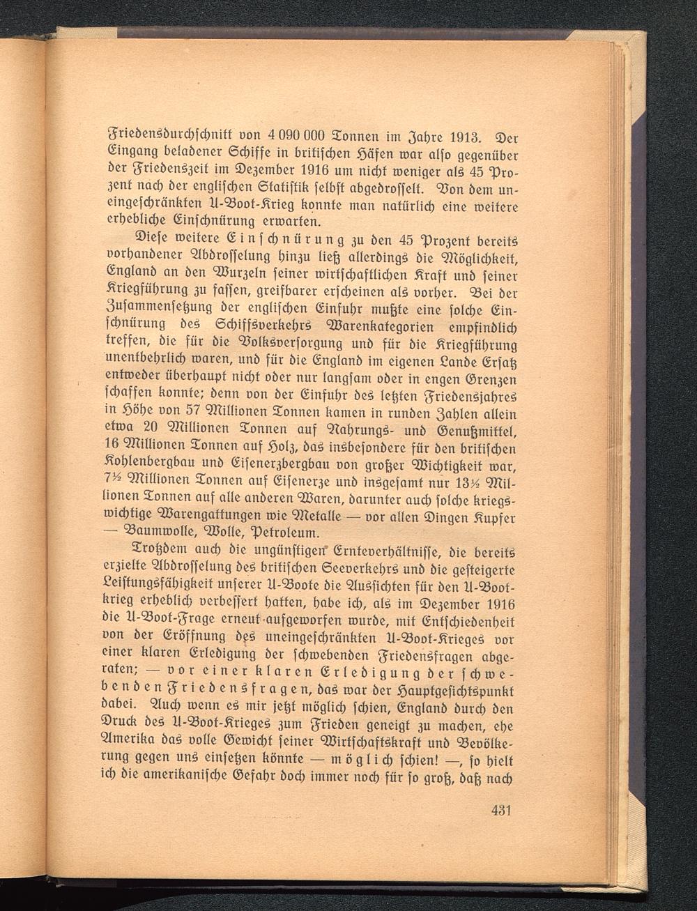 Srotjbem auch öie ungünftigen* (Ernfet)erhälfniffe, bie bereiteer3ielte "Slbbroffelung be3 britifchen SeeoerkehrS unb bie gefteigerteCeiftung^fähigkeit unferer U-SSoote bie Sluöfichten für ben ll-^oof-krieg erheblich oerbeffert hoffen, höbe ich, al3 im ®e3ember 1916bie H-^oot-grage erneut aufgeroorfen rourbe, mit (Enffchiebenheift>on ber (Eröffnung bes> uneingefchränkten li-SJoof-KriegeS ooreiner klaren (Erlebigung ber fchroebenben grieben^fragen abge-raten; — oor einer klaren (Erlebigung ber fchroe-benbengrieben^fragen, roar öer JöaupfgefichfSpunktbabei. Qluch roenn e3 mir jetjt möglich fchicri, (Englanb burch ben5)ruck be3 XI-^oot-KriegeS 3um ^rieben geneigt 3U machen, eheAmerika bas> oolle ©eroichf feiner Dirffchaftäkraft unb 93eDölke-rung gegen un£ einfetjen könnte — m ö g l i ch fchien! —, fo hieltich f>ie amerikanifche Oefahr boch immer noch für fo groß, baß nach