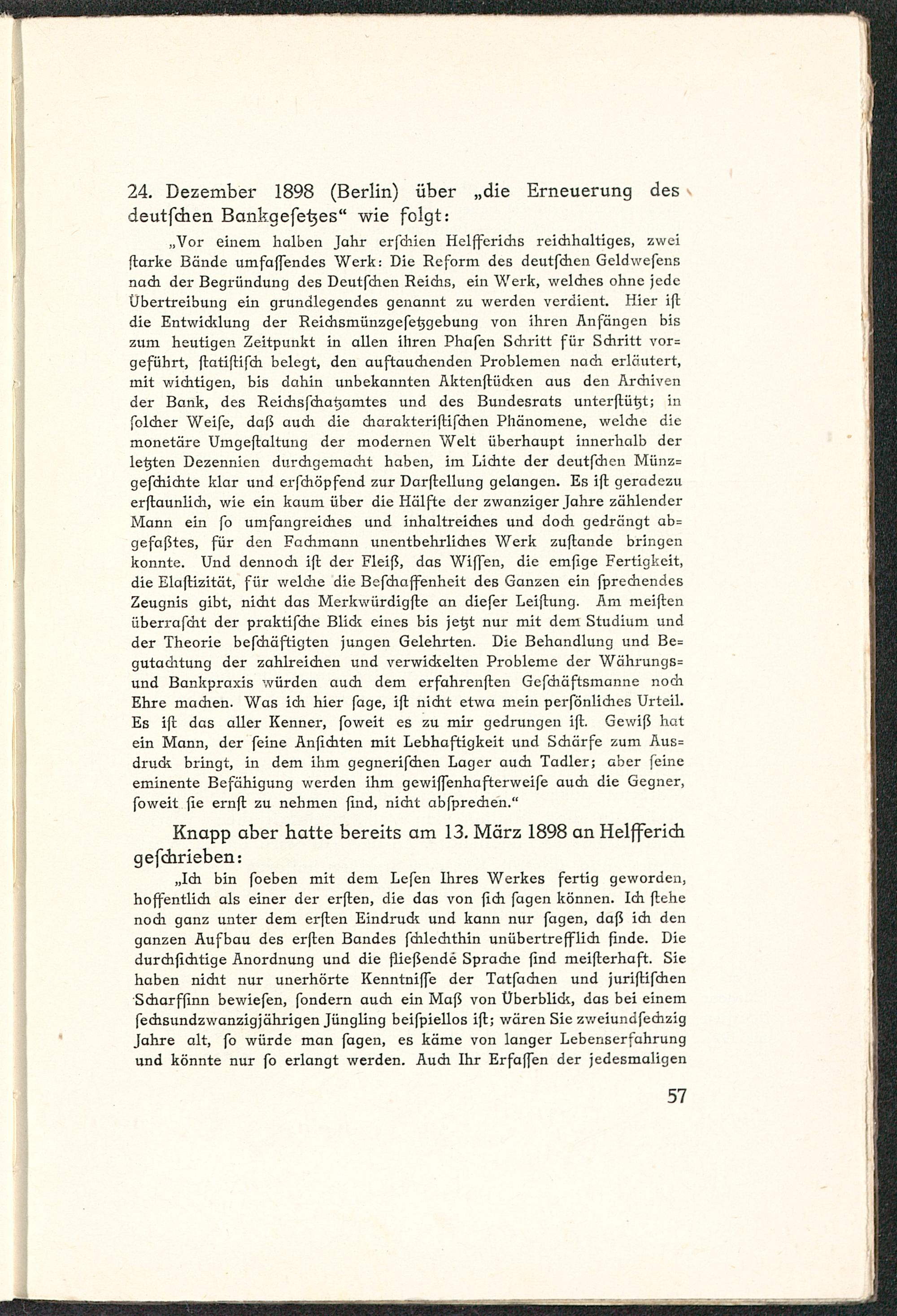„Vor einem halben Jahr erfchien Helfferidis reichhaltiges, zweiftarke Bände umfaffendes Werk: Die Reform des deutfdien Geldwefensnach der Begründung des Deutfdien Reichs, ein Werk, welches ohne jedeÜbertreibung ein grundlegendes genannt zu werden verdient. Hier iftdie Entwiddung der Reidismünzgefe^gebung von ihren Anfängen biszum heutigen Zeitpunkt in allen ihren Phafen Schritt für Schritt vor=geführt, ftatiftifdi belegt, den auftauchenden Problemen nach erläutert,mit wichtigen, bis dahin unbekannten Aktenflüdten aus den Archivender Bank, des Reidisfdiagamtes und des Bundesrats unterftüt^t; infolcher Weife, daß auch die charakteriftifchen Phänomene, welche diemonetäre Umgeftaltung der modernen Welt überhaupt innerhalb derlegten Dezennien durchgemacht haben, im Lichte der deutfdien Münz=gefchichte klar und erfchöpfend zur Darfteilung gelangen. Es ift geradezuerftaunlidi, wie ein kaum über die Hälfte der zwanziger Jahre zählenderMann ein fo umfangreiches und inhaltreiches und doch gedrängt ab=gefaßtes, für den Fachmann unentbehrliches Werk zuftande bringenkonnte. Und dennodi ift der Fleiß, das Wiffen, die emfige Fertigkeit,die Elaftizität, für welche die Bcfdiaffenheit des Ganzen ein [brechendesZeugnis gibt, nicht das Merkwürdigfte an diefer Leiftung. Am meiftenüberrafcht der praktifdie Blidt eines bis jetjt nur mit dem Studium undder Theorie befdiäftigten jungen Gelehrten. Die Behandlung und Be=gutaditung der zahlreichen und verwickelten Probleme der Währungs=und Bankpraxis würden auch dem erfahrenden Gefdiäftsmanne nochEhre machen. Was ich hier fage, ift nicht etwa mein perfönliches Urteil.Es ift das aller Kenner, foweit es zu mir gedrungen ift. Gewiß hatein Mann, der feine Anflehten mit Lebhaftigkeit und Schärfe zum Aus=druck bringt, in dem ihm gegnerifefaen Lager auch Tadler; aber feineeminente Befähigung werden ihm gewiffenhafterweife auch die Gegner,foweit fie ernfl zu nehmen find, nicht abfpredien."