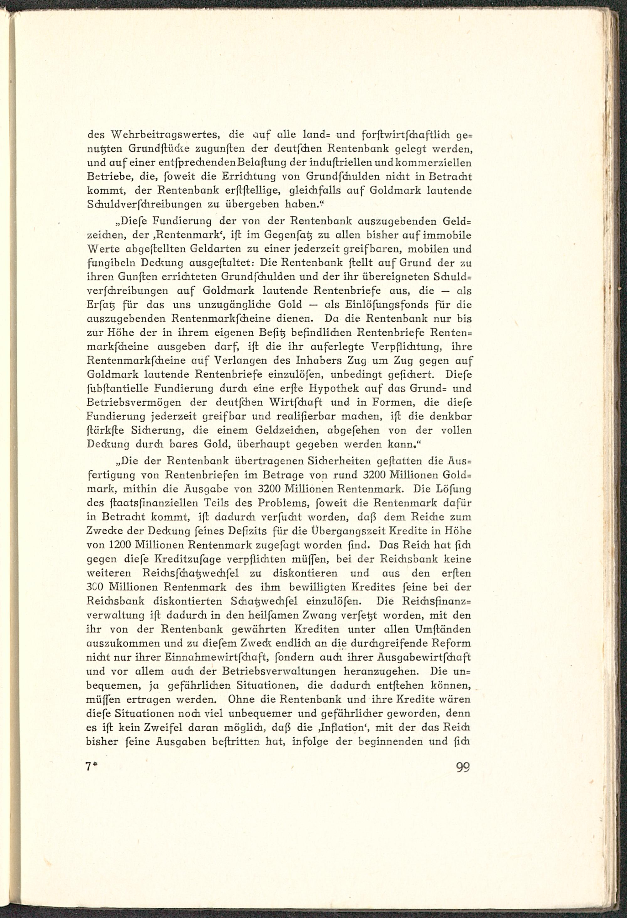 Diefe Fundierung der von der Rentenbank auszugebenden Geld=zeichen, der ,Rentenmark', ift im Gegenfatj zu allen bisher auf immobileWerte abgeheilten Geldarten zu einer jederzeit greifboren, mobilen undfungibeln Deckung ausgeftaltet: Die Rentenbank (teilt auf Grund der zuihren Gunften errichteten Grundfdiulden und der ihr übereigneten Sdiuld=verfchreibungen auf Goldmark lautende Rentenbriefe aus, die alsErfatj für das uns unzugängliche Gold als Einlöfungsfonds für dieauszugebenden Rentenmarkfcheine dienen. Da die Rentenbank nur biszur Höhe der in ihrem eigenen Befit; befindlichen Rentenbriefe Renten=markfcheine ausgeben darf, ift die ihr auferlegte Verpflichtung, ihreRentenmarkfcheine auf Verlangen des Inhabers Zug um Zug gegen aufGoldmark lautende Rentenbriefe einzulöfen, unbedingt gefichert. Diefefubflantielle Fundierung durch eine erfle Hypothek auf das Grund= undBetriebsvermögen der deutfdien Wirtfchaft und in Formen, die diefeFundierung jederzeit greifbar und realifierbar machen, ift die denkbarflärkfle Sicherung, die einem Geldzeichen, abgefehen von der vollenDeckung durch bares Gold, überhaupt gegeben werden kann."