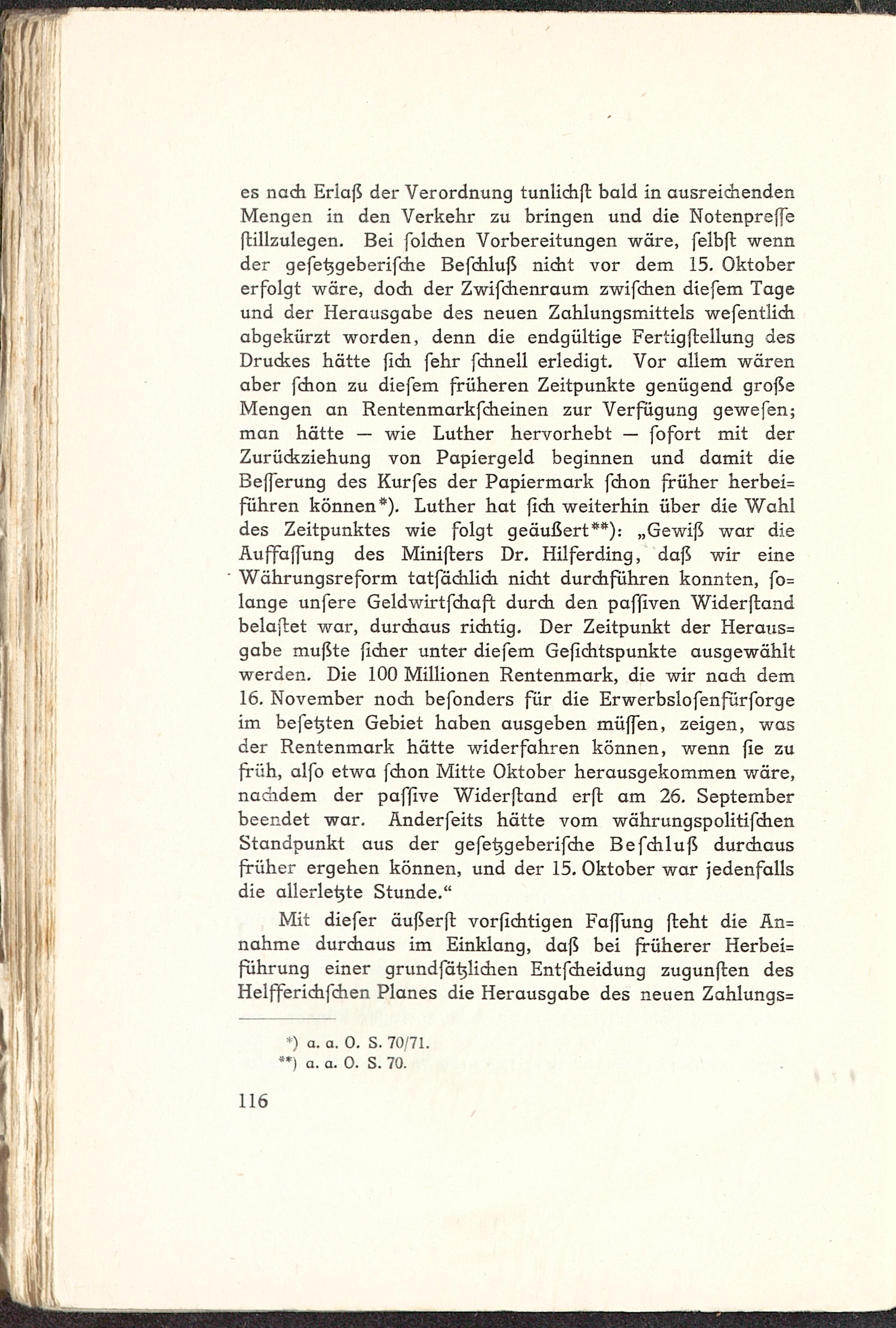 es nadi Erlaß der Verordnung tunlidift bald in ausreichendenMengen in den Verkehr zu bringen und die Notenpreffeflillzulegen. Bei fbichen Vorbereitungen wäre, felbft wennder gefetjgeberifche Befchluß nicht vor dem 15. Oktobererfolgt wäre, doch der Zwifchenraum zwifchen diefem Tageund der Herausgabe des neuen Zahlungsmittels wefentlidiabgekürzt worden, denn die endgültige Fertigftellung desDruckes hätte {Ich fehr fchnell erledigt. Vor allem wärenaber fchon zu diefem früheren Zeitpunkte genügend großeMengen an Rentenmarkfcheinen zur Verfugung gewefen;man hätte — wie Luther hervorhebt — fofort mit derZurückziehung von Papiergeld beginnen und damit dieBefferung des Kurfes der Papiermark fchon früher herbei=führen können*). Luther hat fich weiterhin über die Wahldes Zeitpunktes wie folgt geäußert**): „Gewiß war dieAuffaffung des Minifters Dr. Hilferding, daß wir eineWährungsreform tatfächlich nicht durchfuhren konnten, fo=lange unfere Geldwirtfchaft durch den paffiven Widerftandbelaftet war, durchaus richtig. Der Zeitpunkt der Heraus=gäbe mußte ficher unter diefem Gefichtspunkte ausgewähltwerden. Die 100 Millionen Rentenmark, die wir nach dem16. November noch befonders für die Erwerbslofenfürforgeim befetjten Gebiet haben ausgeben müffen, zeigen, wasder Rentenmark hätte widerfahren können, wenn fie zufrüh, alfo etwa fchon Mitte Oktober herausgekommen wäre,nachdem der pafjfive Widerftand erft am 26. Septemberbeendet war. Anderfeits hätte vom WährungspolitifchenStandpunkt aus der gefet>geberifche Befchluß durchausfrüher ergehen können, und der 15. Oktober war jedenfallsdie allerletjte Stunde."