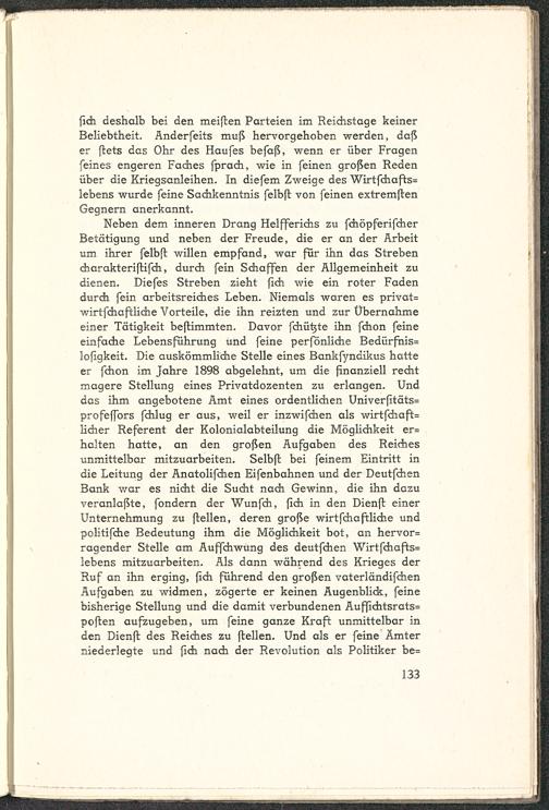 Neben dem inneren Drang Helfferichs zu fchöpferifcherBetätigung und neben der Freude, die er an der Arbeitum ihrer felbft willen empfand, war für ihn das Strebencharakteriftifch, durch fein Schaffen der Allgemeinheit zudienen. Diefes Streben zieht fich wie ein roter Fadendurch fein arbeitsreiches Leben. Niemals waren es privat=wirtfdiafbliche Vorteile, die ihn reizten und zur Übernahmeeiner Tätigkeit beflimmten. Davor fchütjte ihn fchon feineeinfache Lebensführung und feine perfönliche Bedürfnis=lofigkeit. Die auskömmliche Stelle eines Bankfyndikus hatteer fchon im Jahre 1898 abgelehnt, um die finanziell rechtmagere Stellung eines Privatdozenten zu erlangen. Unddas ihm angebotene Amt eines ordentlichen Univerfitäts=profeffors fchlug er aus, weil er inzwischen als wirtfchaft=lieber Referent der Kolonialabteilung die Möglichkeit er=halten hatte, an den großen Aufgaben des Reichesunmittelbar mitzuarbeiten. Selbfl bei feinem Eintritt indie Leitung der Anatolifchen Eifenbahnen und der DeutfchenBank war es nicht die Sucht nach Gewinn, die ihn dazuveranlaßte, fondern der Wunfeh, fich in den Dienft einerUnternehmung zu ftellen, deren große wirtfehaftliche undpolitifche Bedeutung ihm die Möglichkeit bot, an hervor=ragender Stelle am Auffchwung des deutfchen Wirtfchafts=lebens mitzuarbeiten. Als dann während des Krieges derRuf an ihn erging, fich führend den großen vaterländifchenAufgaben zu widmen, zögerte er keinen Augenblick, feinebisherige Stellung und die damit verbundenen Auffichtsrats=poften aufzugeben, um feine ganze Kraft unmittelbar inden Dienfl des Reiches zu ftellen. Und als er feine Ämterniederlegte und fich nach der Revolution als Politiker be=
