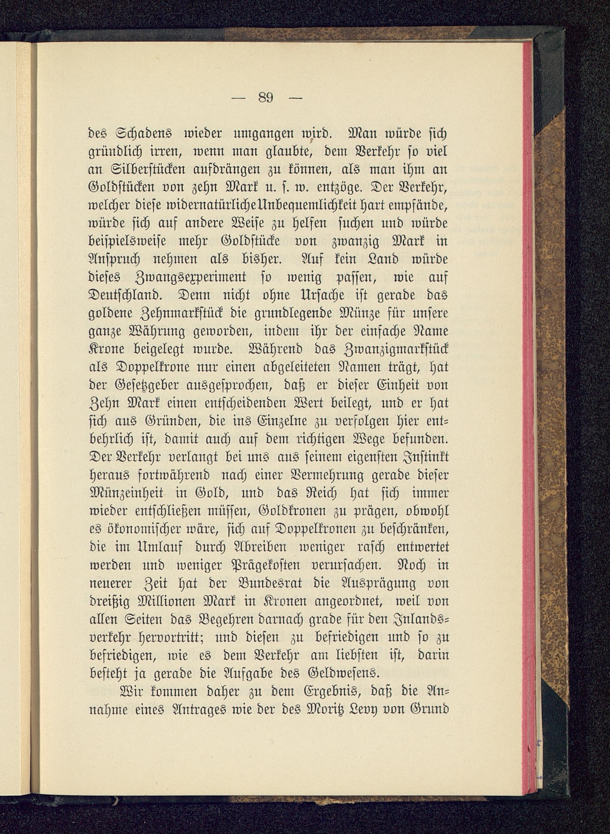 des Schadens wieder umgangen wird. Man würde sichgründlich irren, wenn man glaubte, dem Verkehr so vielan Silberstücken aufdrängen zu können, als man ihm anGoldstücken von zehn Mark u. s. w. entzöge. Der Verkehr,welcher diese widernatürlicheUnbequemlichkeit hart empfände,würde sich auf andere Weise zu helfen suchen und würdebeispielsweise mehr Goldstücke von zwanzig Mark inAnspruch nehmen als bisher. Auf kein Land würdedieses Zwangsexperiment so wenig passen, wie aufDeutschland . Denn nicht ohne Ursache ist gerade dasgoldene Zehnmarkstück die grundlegende Münze für unsereganze Währung geworden, indem ihr der einfache NameKrone beigelegt wurde. Während das Zwanzigmarkstückals Doppelkrone nur einen abgeleiteten Namen trägt, hatder Gesetzgeber ausgesprochen, daß er dieser Einheit vonZehn Mark einen entscheidenden Wert beilegt, und er hatsich aus Gründen, die ins Einzelne zu verfolgen hier ent-behrlich ist, damit auch auf dem richtigen Wege befunden.Der Verkehr verlangt bei uns aus seinen? eigensten Instinktheraus fortwährend nach einer Vermehrung gerade dieserMünzeinheit in Gold, und das Reich hat sich immerwieder entschließen müssen, Goldkronen zu prägen, obwohles ökonomischer wäre, sich auf Doppelkronen zu beschränken,die im Umlauf durch Abreiben weniger rasch entwertetwerden und weniger Prägekosten verursachen. Noch inneuerer Zeit hat der Bundesrat die Ausprägung vondreißig Millionen Mark in Kronen angeordnet, weil vonallen Seiten das Begehren darnach grade für den Jnlands-verkehr hervortritt; und diesen zu befriedigen und so zubefriedigen, wie es dem Verkehr am liebsten ist, darinbesteht ja gerade die Aufgabe des Geldwesens.