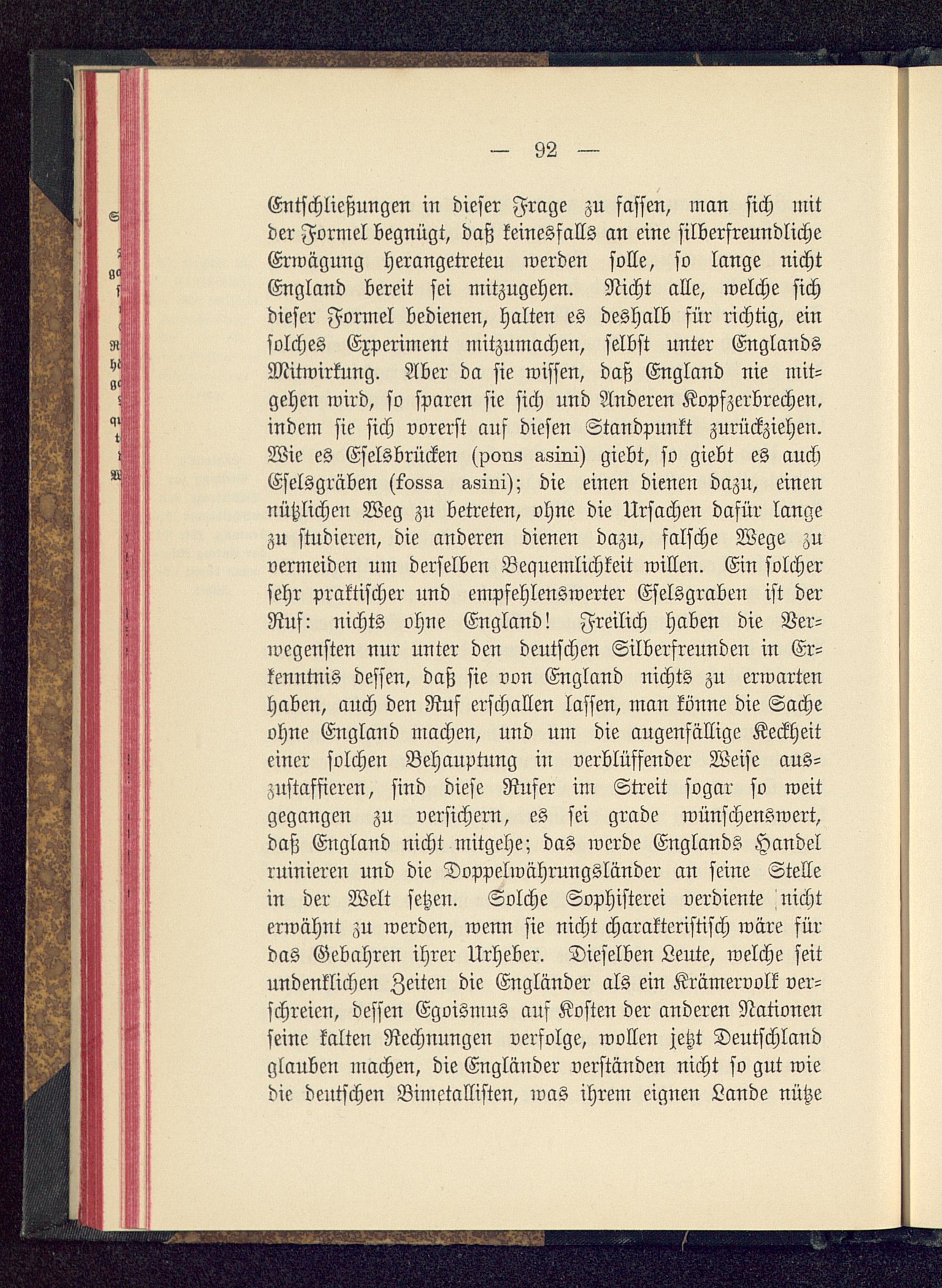 Entschließungen in dieser Frage zu fassen, man sich mitder Formel begnügt, daß keinesfalls an eine silberfreundlicheErwägung herangetreten werden solle, so lange nichtEngland bereit sei mitzugehen. Nicht alle, welche sichdieser Formel bedienen, halten es deshalb für richtig, einsolches Experiment mitzumachen, selbst unter Englands Mitwirkung. Aber da sie wissen, daß England nie mit-gehen wird, so sparen sie sich und Anderen Kopfzerbrechen,indem sie sich vorerst auf diesen Standpunkt zurückziehen.Wie es Eselsbrücken (pons a3ini) giebt, so giebt es auchEselsgräben (to88a asirii); die einen dienen dazu, einennützlichen Weg zu betreten, ohne die Ursachen dafür langezu studieren, die anderen dienen dazu, falsche Wege zuvermeiden um derselben Bequemlichkeit willen. Ein solchersehr praktischer und empfehlenswerter Eselsgraben ist derRuf: nichts ohne England ! Freilich haben die Ver-wegensten nur unter den deutschen Silberfreunden in Er-kenntnis dessen, daß sie von England nichts zn erwartenhaben, auch den Ruf erschallen lassen, man könne die Sacheohne England machen, und um die augenfällige Keckheiteiner solchen Behauptung iu verblüffender Weise aus-zustaffieren, sind diese Rufer im Streit fogar so weitgegangen zu versichern, es sei grade wünschenswert,daß England nicht mitgehe; das werde Englands Handelruinieren und die Doppelwährungsländer an seine Stellein der Welt setzen. Solche Sophisterei verdiente nichterwähnt zu werden, wenn sie nicht charakteristisch wäre fürdas Gebahren ihrer Urheber. Dieselben Leute, welche seitundenklichen Zeiten die Engländer als ein Krämervolk ver-schreien, dessen Egoismus auf Kosten der anderen Naüonenseine kalten Rechnungen verfolge, wollen jetzt Deutschland glauben machen, die Engländer verständen nicht so gut wiedie deutschen Binictallisten, was ihrem eignen Lande nütze