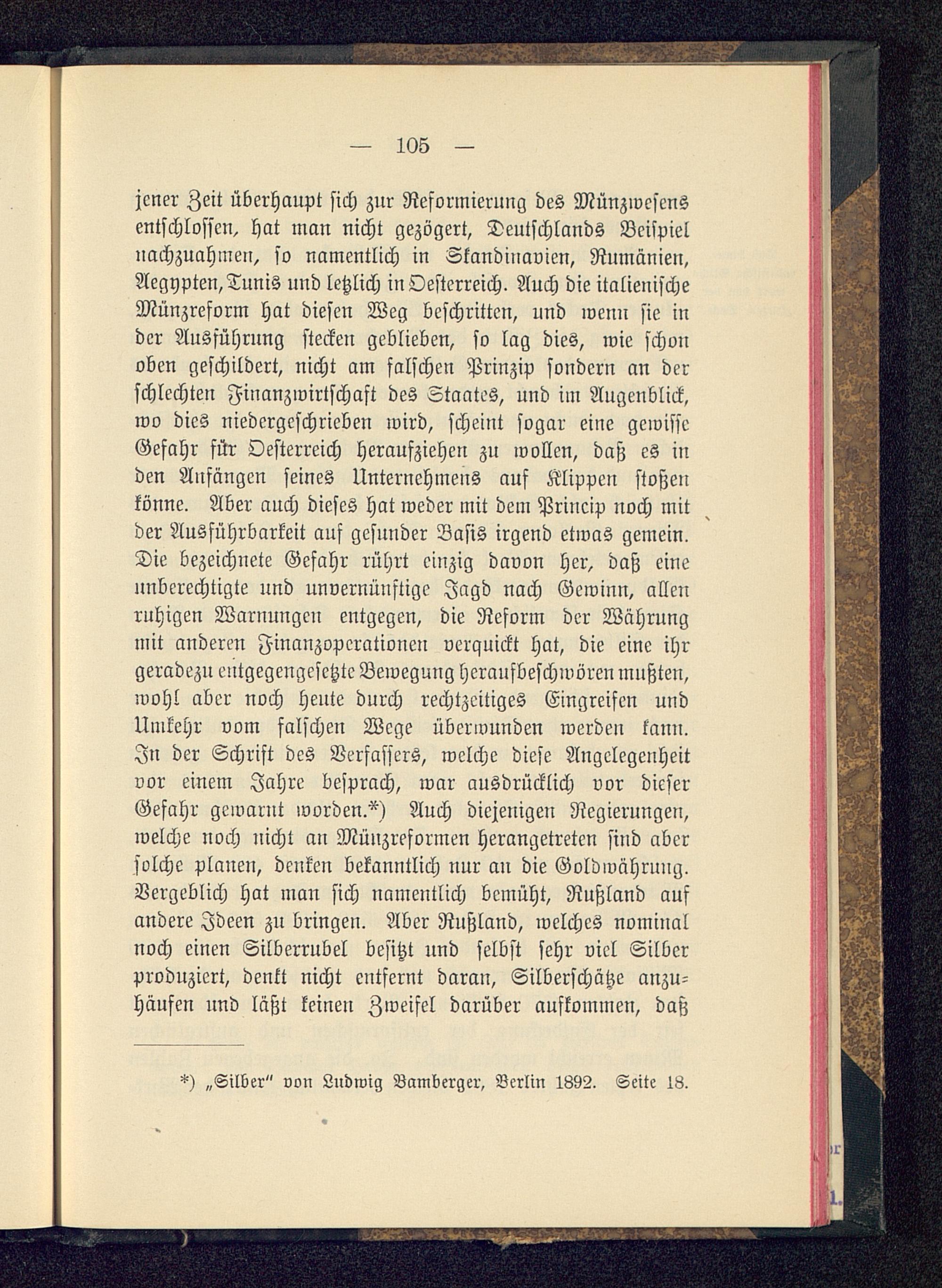 jener Zeit überhaupt sich zur Reformierung des Müuzwesensentschlossen, hat man nicht gezögert, Deutschlands Beispielnachzuahmen, so namentlich in Skandinavien, Rumänien ,Aegypten,Tunis und letzlich in Oesterreich . Auch die italienischeMünzreform hat diesen Weg beschritten, und wenn sie inder Ausführung stecken geblieben, so lag dies, wie schonoben geschildert, nicht am falschen Prinzip sondern an derschlechten Finanzwirtschaft des Staates, und im Augenblick,wo dies niedergeschrieben wird, scheint sogar eine gewisseGefahr für Oesterreich Heraufziehen zu wollen, daß es inden Anfängen seines Unternehmens auf Klippen stoßenkönne. Aber auch dieses hat weder mit dem Princip noch mitder Ausführbarkeit auf gesunder Basis irgend etwas gemein.Die bezeichnete Gefahr rührt einzig davon her, daß eineunberechtigte und unvernünftige Jagd nach Gewinn, allenruhigen Warnungen entgegen, die Reform der Währungmit anderen Finanzoperationen verquickt hat, die eine ihrgeradezu entgegengesetzte Bewegung heraufbeschwören mnßten,woh! aber noch heute durch rechtzeitiges Eingreifen undUmkehr vom falschen Wege überwunden werden kann.In der Schrift des Verfassers, welche diese Angelegenheitvor einem Jahre besprach, war ausdrücklich vor dieserGefahr gewarnt worden.") Auch diejenigen Regierungen,welche noch nicht an Müuzreformeu herangetreten sind abersolche planen, denken bekanntlich nur an die Goldwährung.Vergeblich hat man sich namentlich bemüht, Rußland aufandere Ideen zu bringen. Aber Rußland , welches nominalnoch einen Silberrubel besitzt und selbst sehr viel Silberproduziert, denkt nicht entfernt daran, Silberschätze anzu-häufen und läßt keinen Zweifel darüber aufkommen, daß