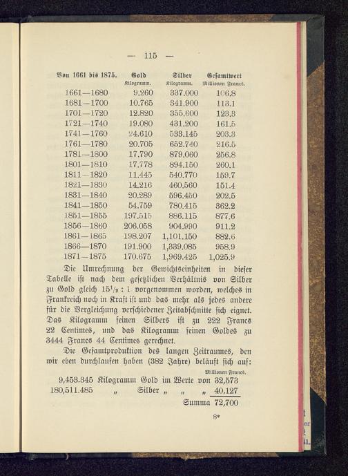Die Umrechnung der Gewichtseinheiten in dieserTabelle ist nach dem gesetzlichen Verhältnis von Silberzu Gold gleich 15^/2: 1 vorgenommen worden, welches inFrankreich noch in Kraft ist und das mehr als jedes anderefür die Vergleichuug verschiedener Zeitabschnitte sich eignet.Das Kilogramm feinen Silbers ist zu 222 Francs22 Centimes, und das Kilogramm feinen Goldes zu3444 Francs 44 Centimes gerechnet.